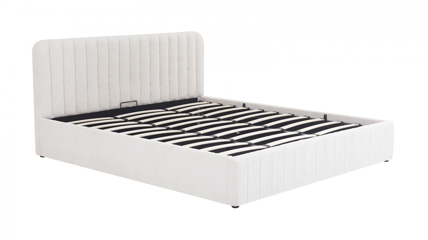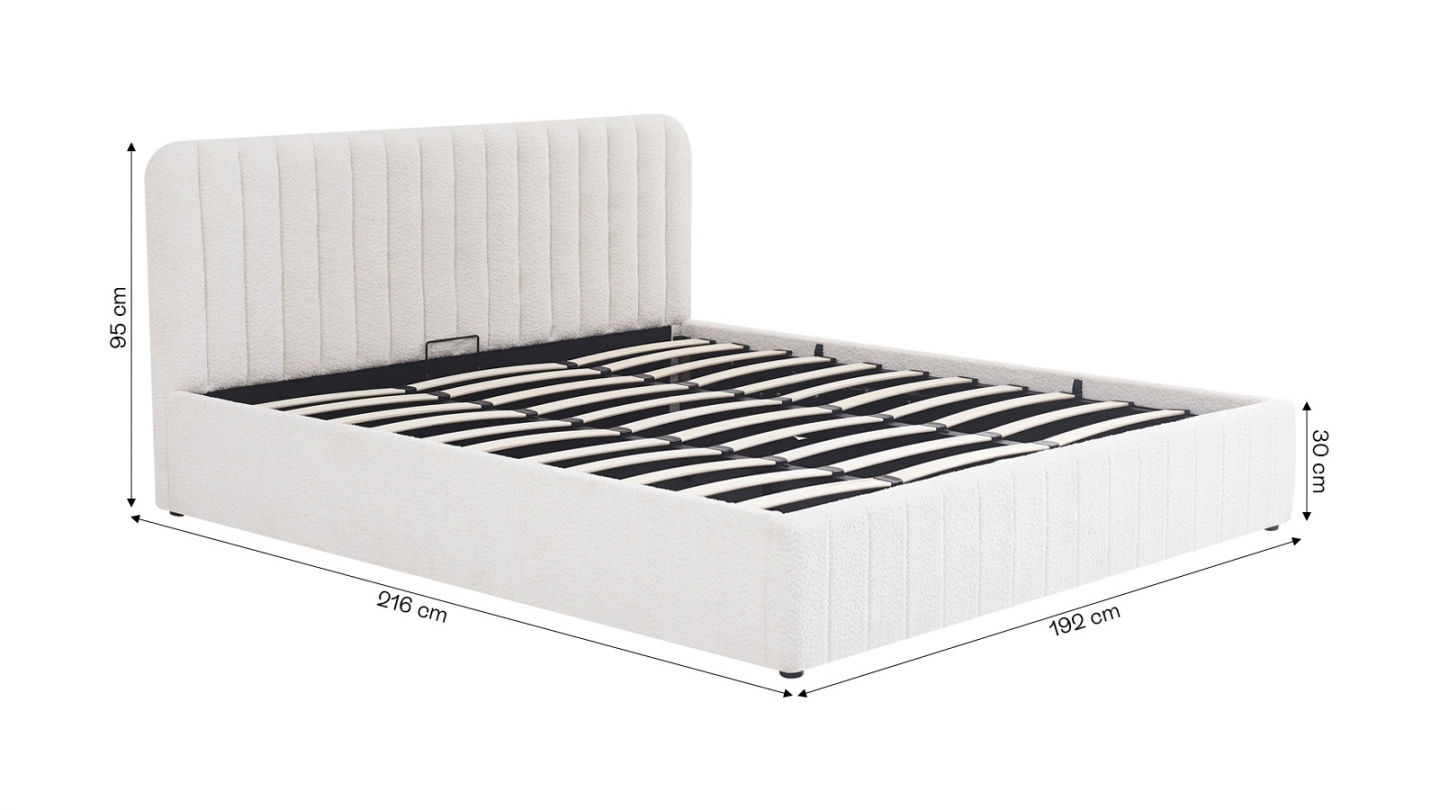 Ensemble Lit adulte + matelasLit coffre en tissu bouclé - Ava • Structure : MDF, bois massif • Revêtement : Tissu bouclé 560 g/m² • Couleur : Beige • Avec tête de lit capitonnée + sommier • Garnissage : Mousse de polyuréthane 22 kg/m3 • Sommier coffre - 24 lattes - avec vérins • Dimensions du couchage : 160 x 200 cm • Dimensions totales : 216...