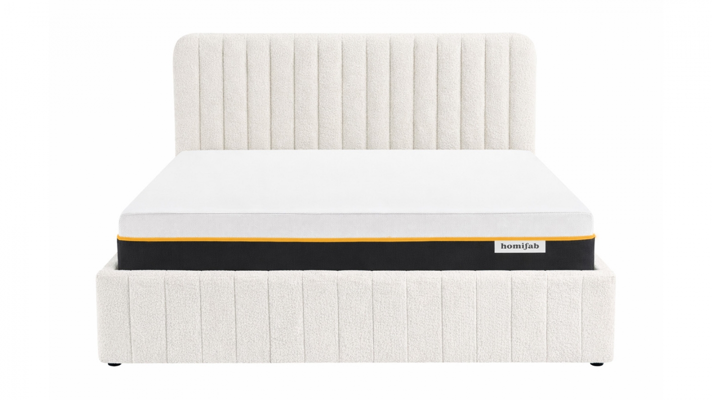 Ensemble Lit adulte + matelasLit coffre en tissu bouclé - Ava • Structure : MDF, bois massif • Revêtement : Tissu bouclé 560 g/m² • Couleur : Beige • Avec tête de lit capitonnée + sommier • Garnissage : Mousse de polyuréthane 22 kg/m3 • Sommier coffre - 24 lattes - avec vérins • Dimensions du couchage : 140 x 190 cm • Dimensions totales : 206...