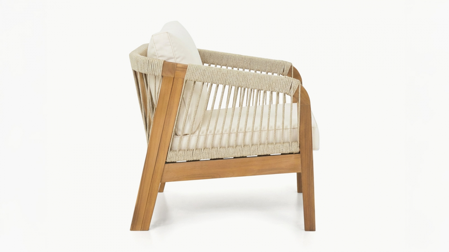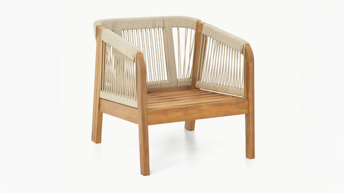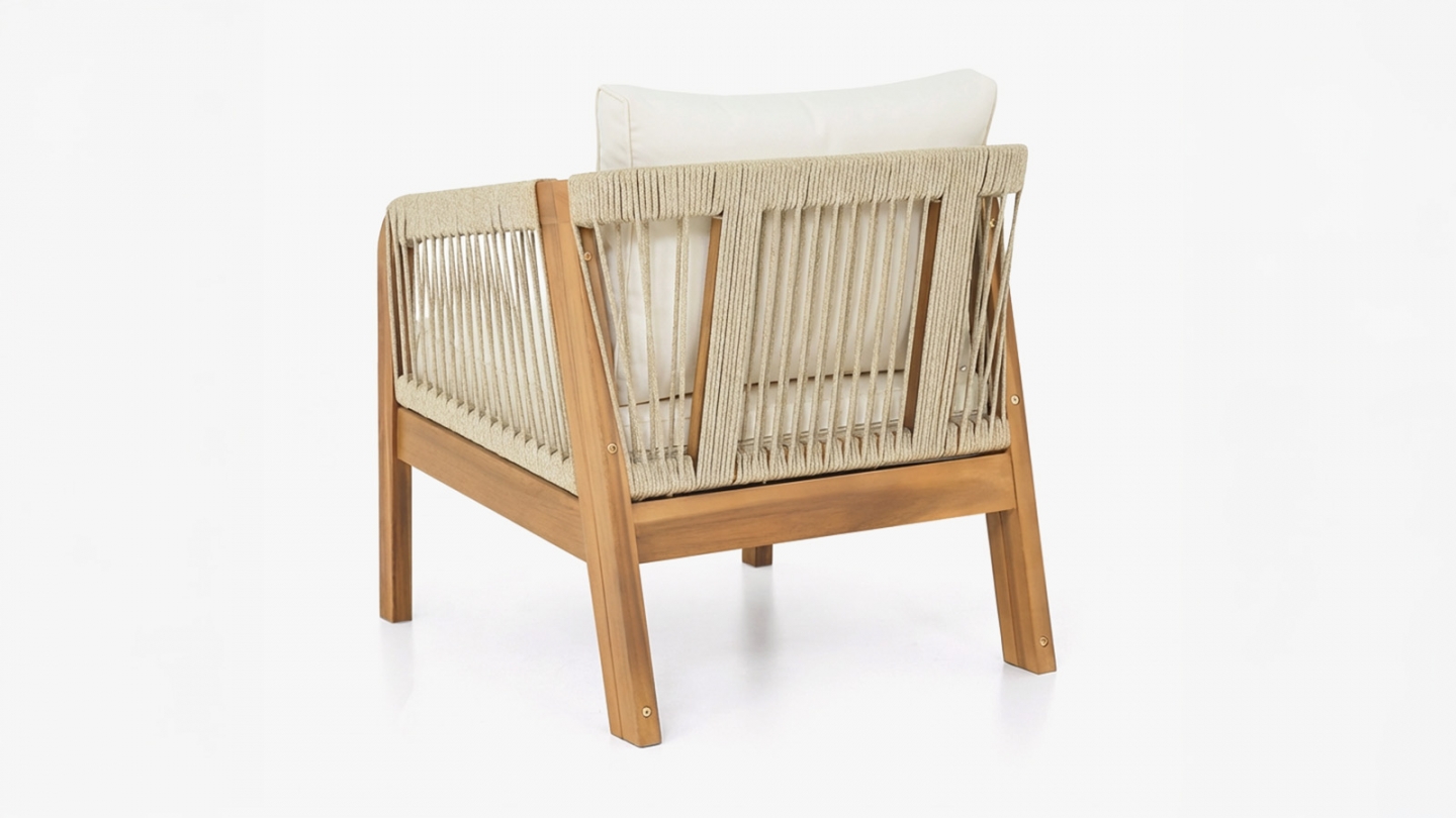 En stockCanapé de jardin - Symi • Nombre de places : 3 • Structure : Bois d'acacia FSC, finition huilée, couleur teck Le bois d’acacia est particulièrement adapté aux salons de jardin grâce à sa robustesse naturelle et sa résistance aux intempéries. • Détails design : Corde en polyester élégante et résistante • Protection : La finition huilée protège contre...