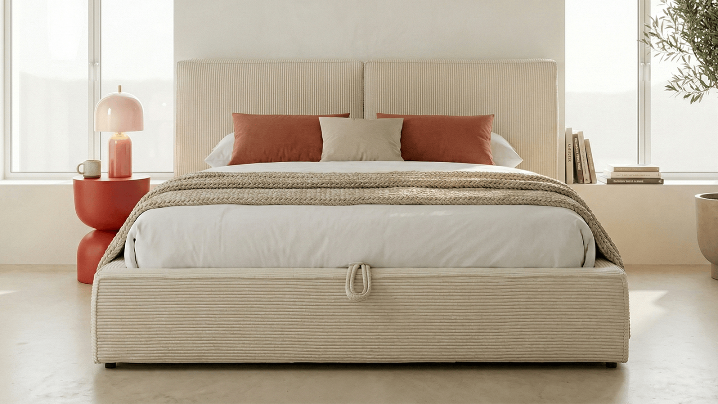 Le lit coffre Arno, est un cocon de douceur et de praticité. Confectionné avec une structure robuste en MDF, ce lit est revêtu d'un velours côtelé beige, doux et résistant.