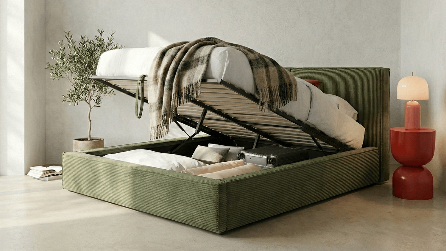 Le lit coffre Arno, est un cocon de douceur et de praticité. Confectionné avec une structure robuste en MDF, ce lit est revêtu d'un velours côtelé kaki, doux et résistant.
