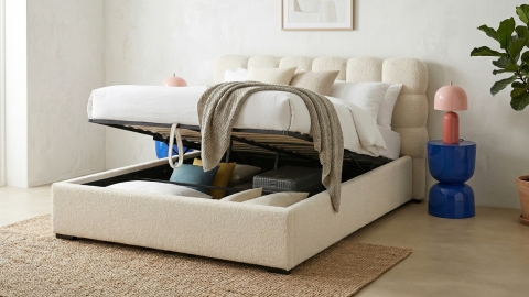 Revêtu d'un tissu bouclé doux et résistant, ce lit de 160x200 offre un confort optimal grâce à son garnissage en mousse. Le sommier à lattes, associé à un système d'ouverture par vérins, vous permet d'accéder facilement au spacieux coffre de rangement. Vous pourrez y ranger tout ce qui vous encombre.