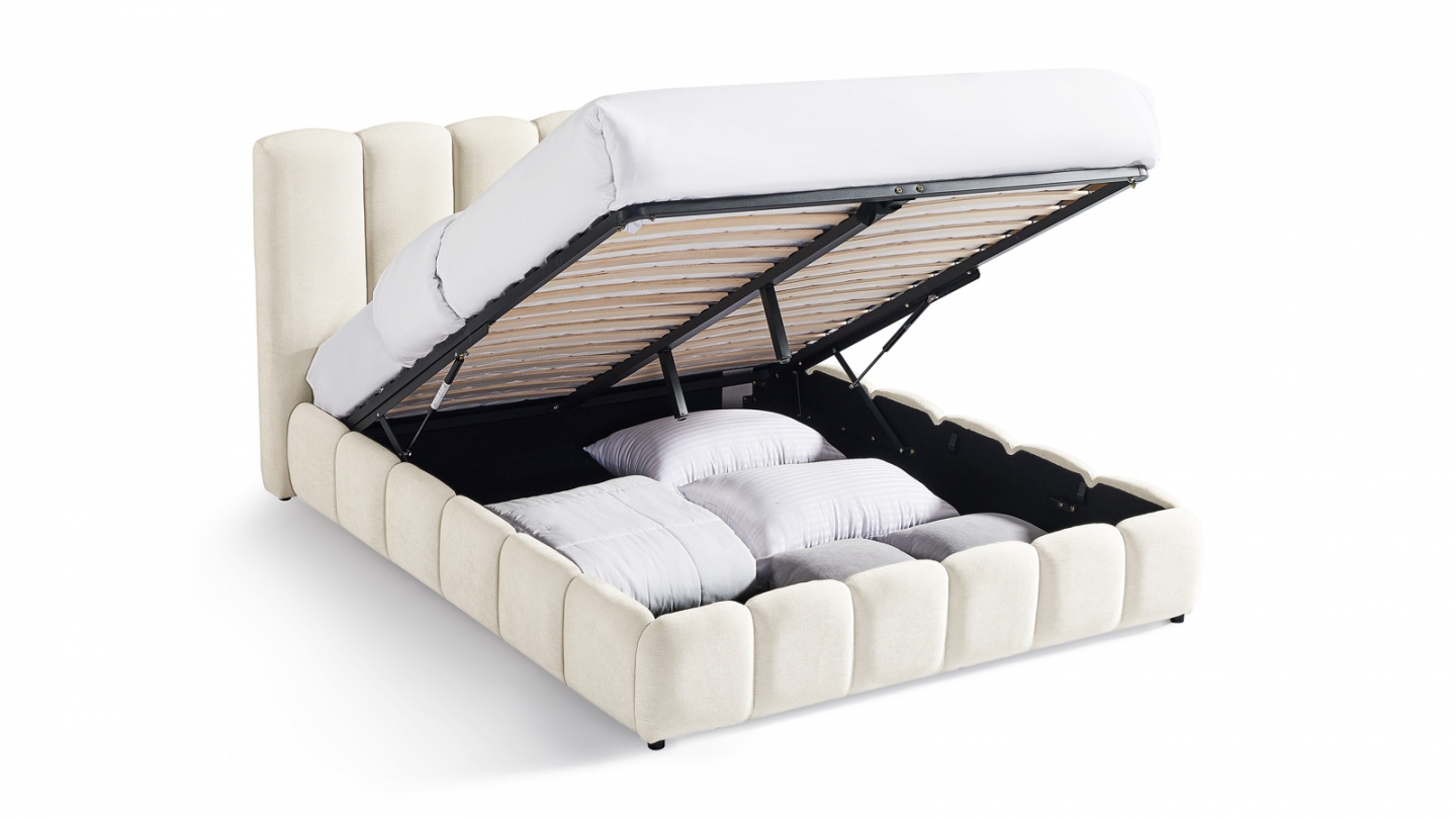 • Lit coffre en tissu bouclé beige avec tête de lit capitonnée • Dimension de couchage : 160 x 200 cm • Couleur : Beige • Revêtement : Tissu bouclé — certifié Oeko-Tex — tissu doux et facile d’entretien • Sommier à lattes inclus (24 lattes) avec vérins pour un accès facile au coffre de rangement • Coffre de rangement intégré, idéal pour optimiser...