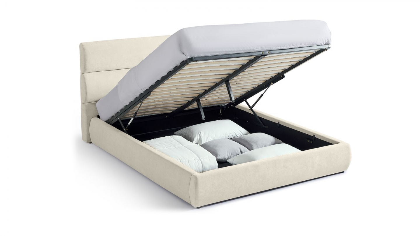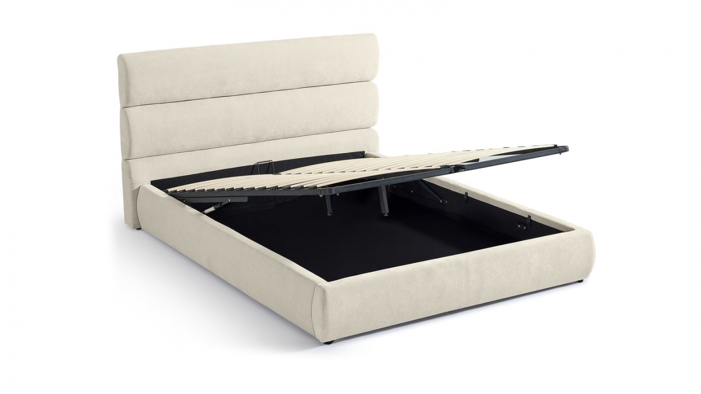 En stockLit coffre en tissu - Tina• Structure : Contreplaqué issu de bois FSC, métal• Revêtement : Tissu 305 g/m² certifié Oekotex• Couleur : Beige• Avec sommier relevable à lattes et tête de lit• Garnissage : Mousse• Sommier 26 lattes (53x9 mm) en bois de peuplier• Dimensions du couchage : 160 x 200 cm• Dimensions totales : 215 x 170 x 88 cm• Dimensions de la...