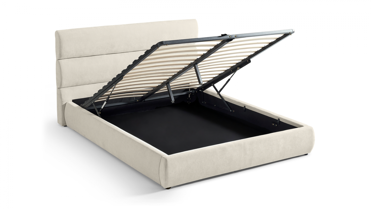 En stockLit coffre avec tête de lit arrondie en tissu bouclé - Suzon • Coloris : Beige • Revêtement : Tissu bouclé • Tête de lit arrondie intégrée • Structure robuste : MDF + bois massif – pour une excellente durabilité • Sommier coffre pratique avec vérins – accès facile au rangement intégré • 24 lattes pour un bon maintien du matelas • Couchage 160 x 200...