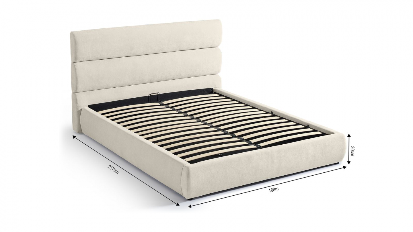 En stockLit coffre en tissu bouclé - Madisson• Structure : MDF• Revêtement : Tissu bouclé• Couleur : Beige• Sommier coffre à lattes• Dimensions du couchage : 160 x 200 cm• Dimensions totales : 228 x 188 x 97 cm• Hauteur du cadre de lit : 28 cm