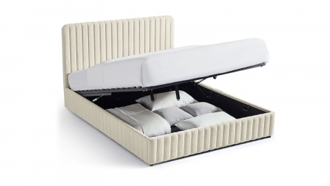 • Lit coffre en velours beige avec tête de lit matelassée • Dimension de couchage : 160 x 200 cm • Couleur : Beige • Revêtement : Velours certifié Oeko-Tex — tissu doux et facile d’entretien • Sommier à lattes inclus (24 lattes) avec vérins pour un accès facile au coffre de rangement • Coffre de rangement intégré, idéal pour optimiser l’espace •...