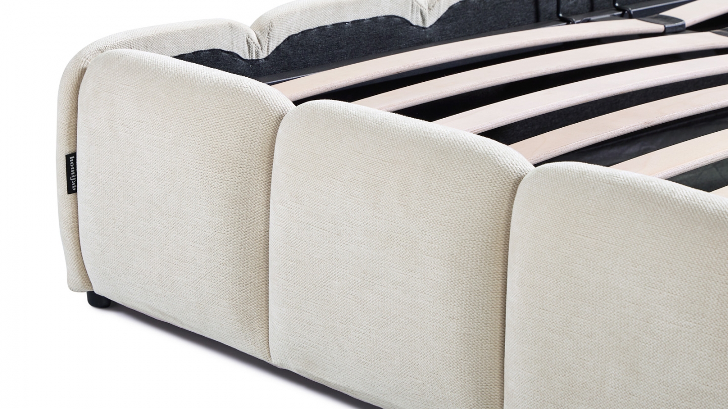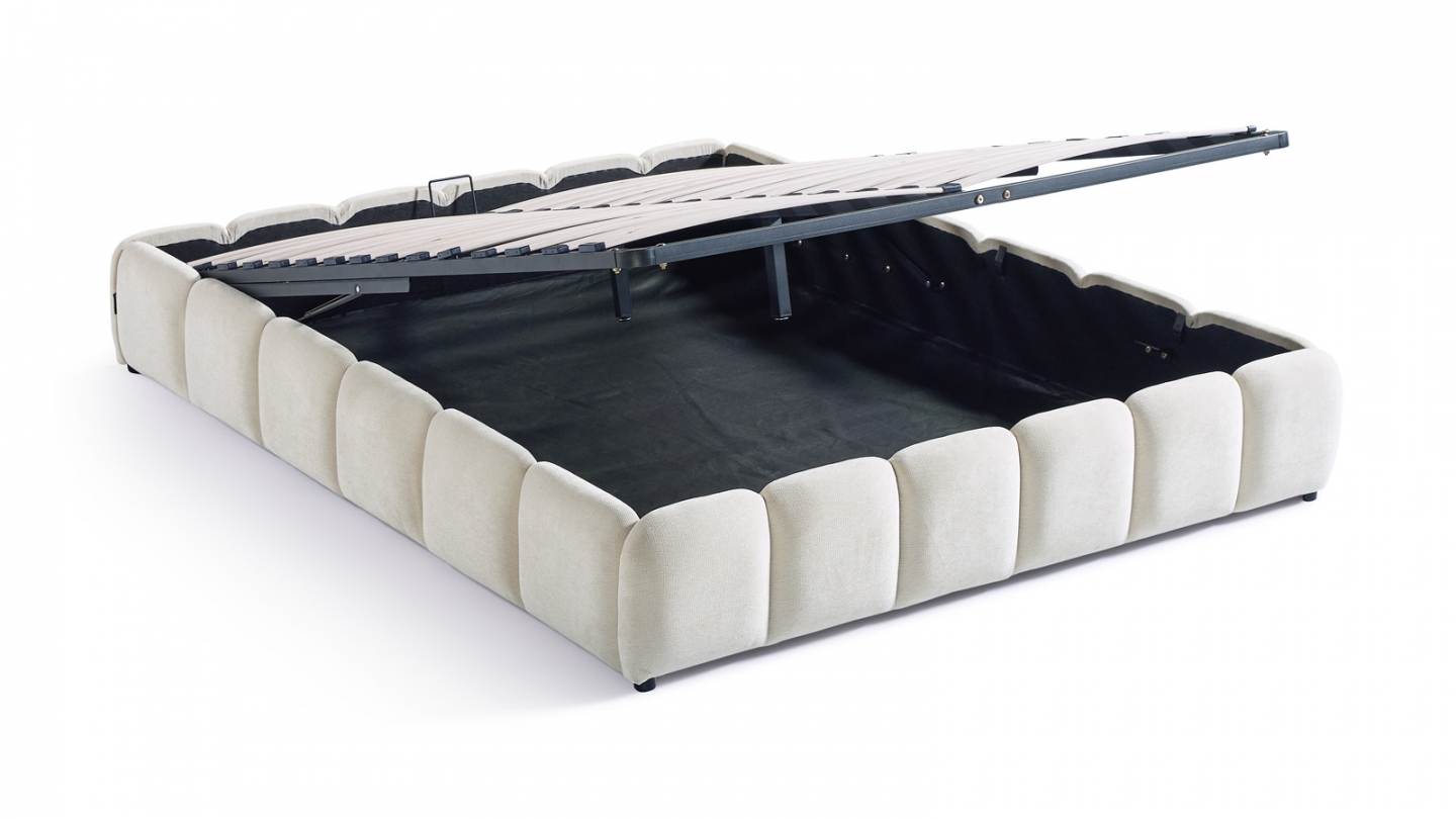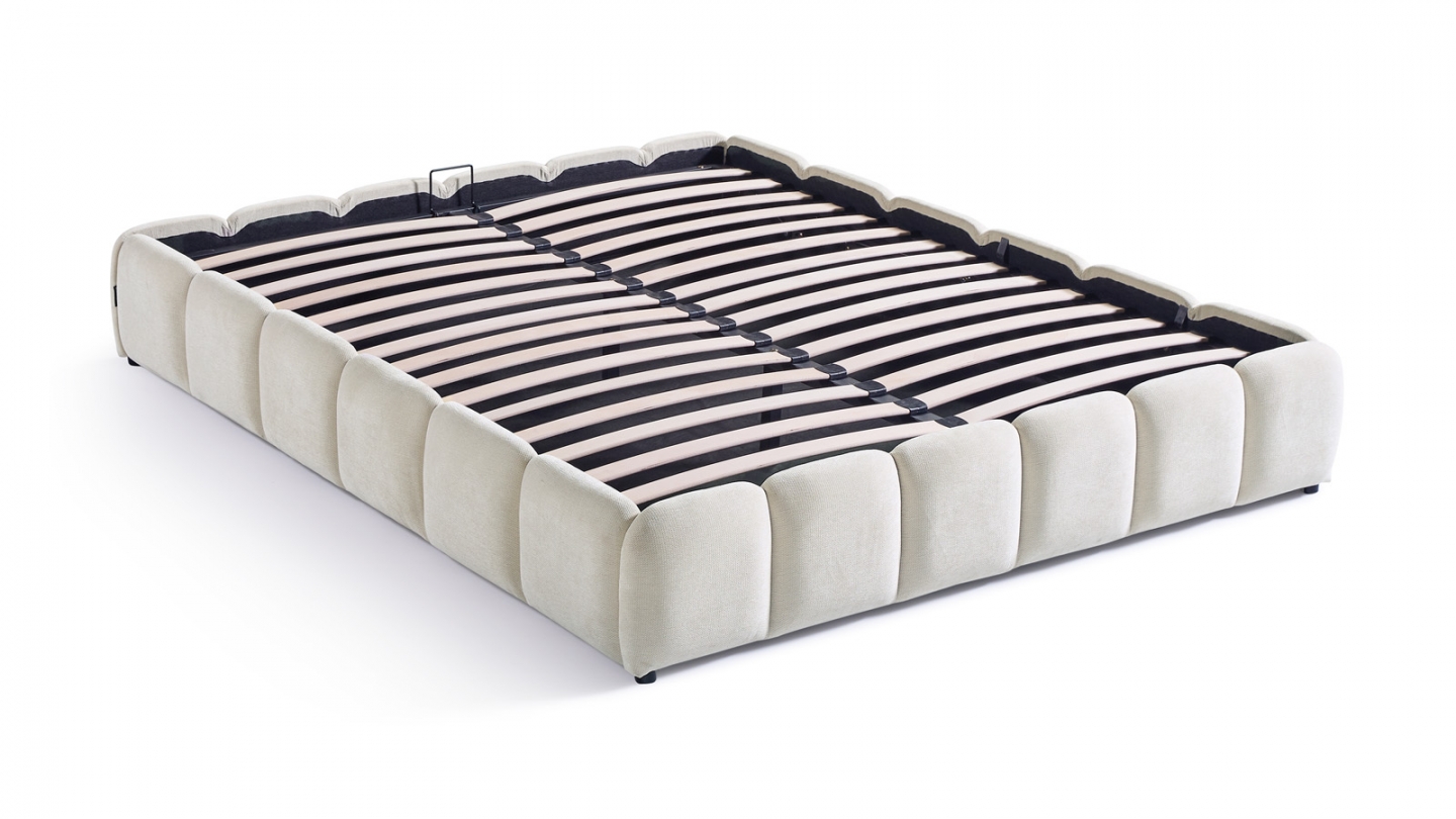 • Sommier 30 lattes en bois de Peuplier (ép. 10 mm). Espacement entre les lattes : 70 mm. Système d'ouverture à vérins hydrauliques.