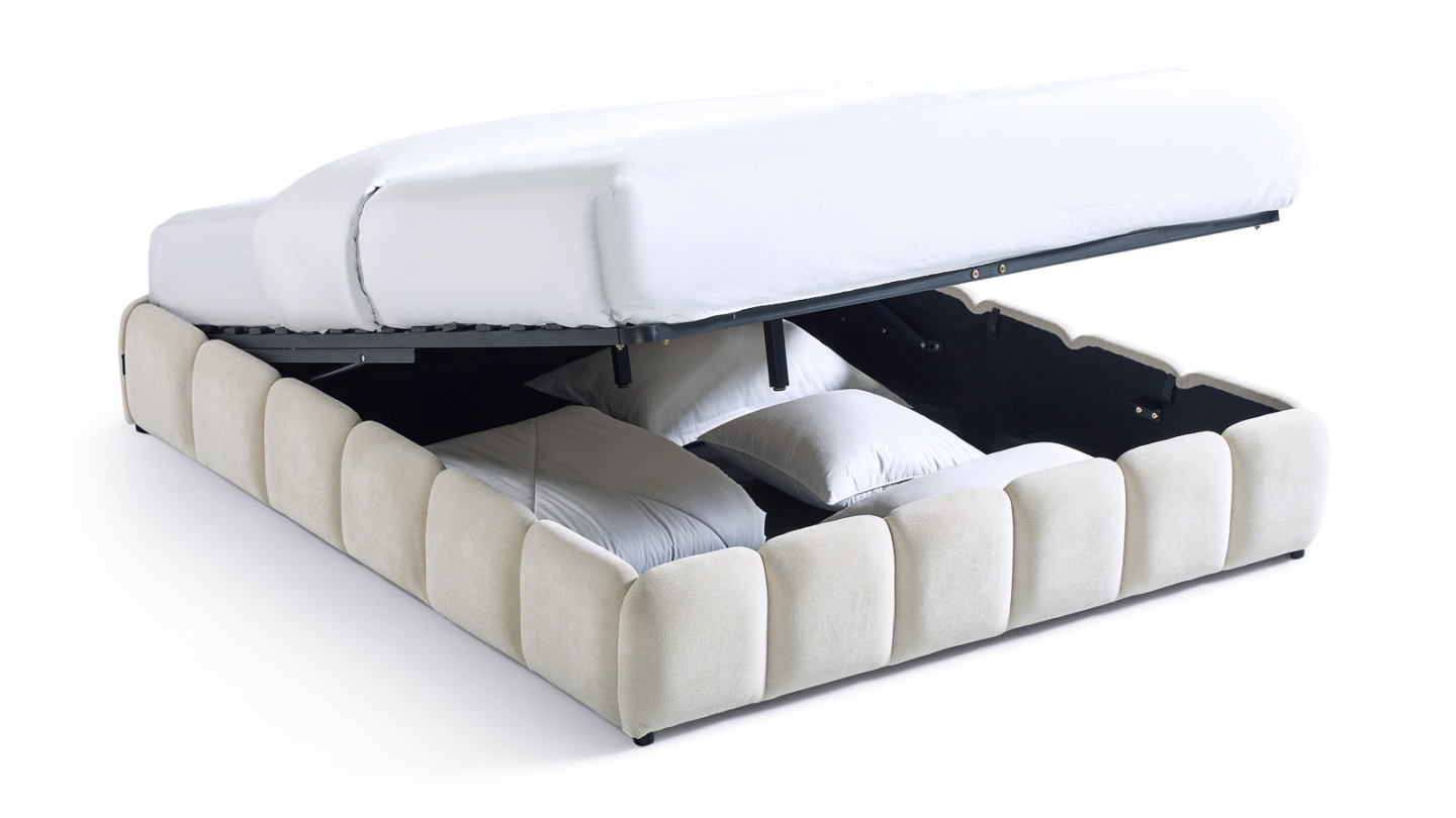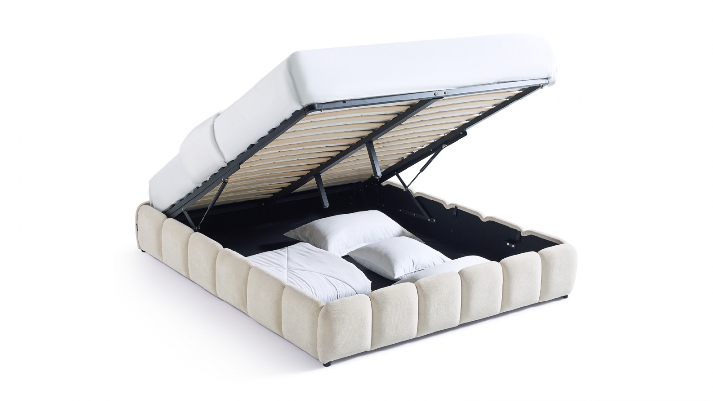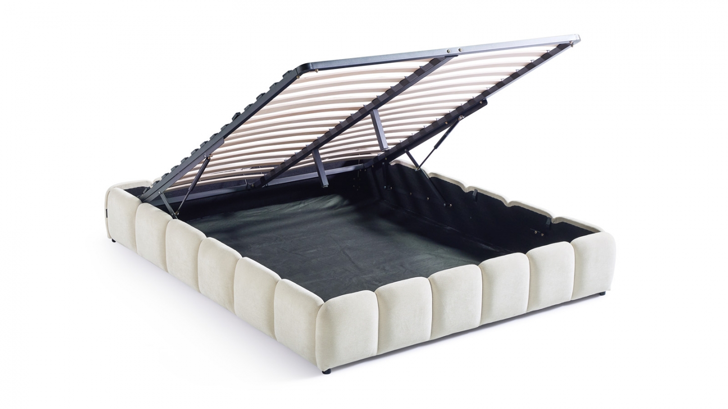 • Sommier 30 lattes en bois de Peuplier (ép. 10 mm). Espacement entre les lattes : 70 mm. Système d'ouverture à vérins hydrauliques.