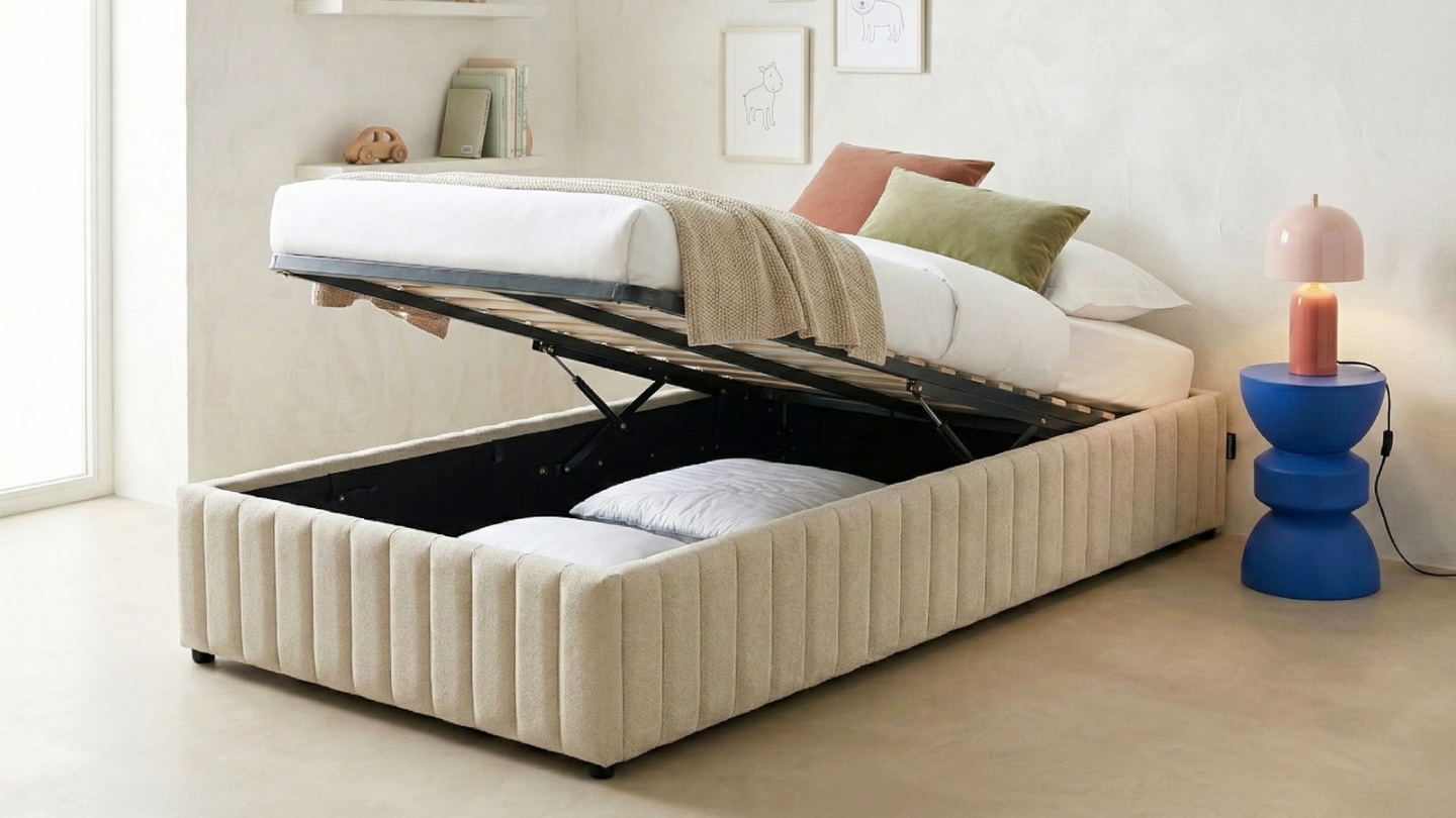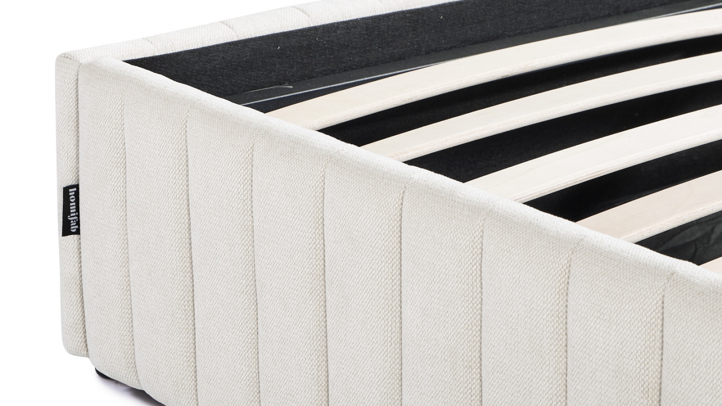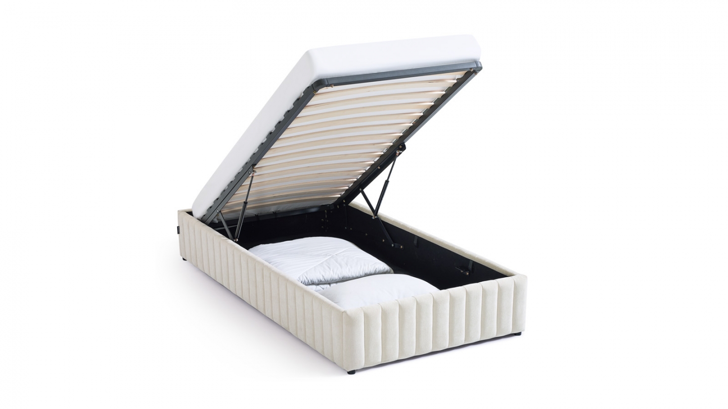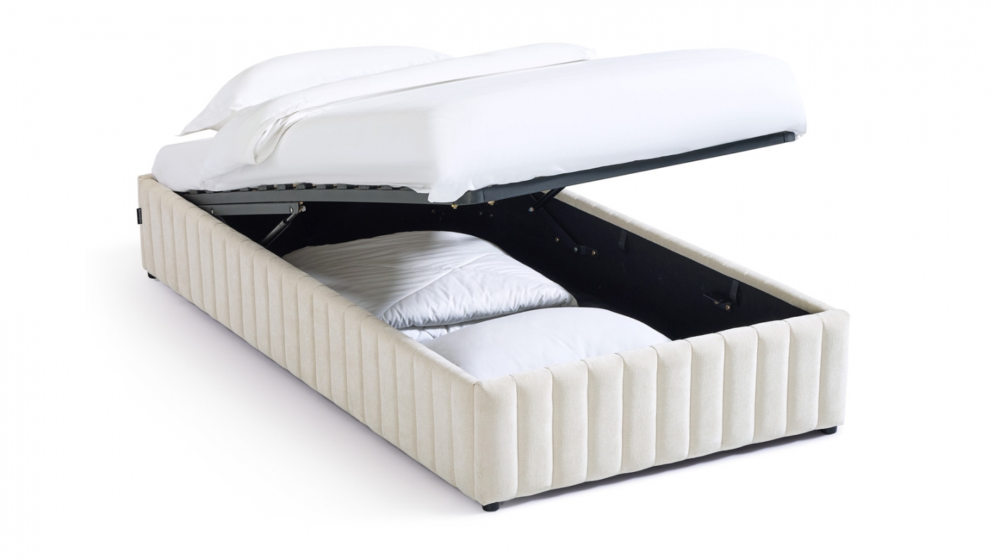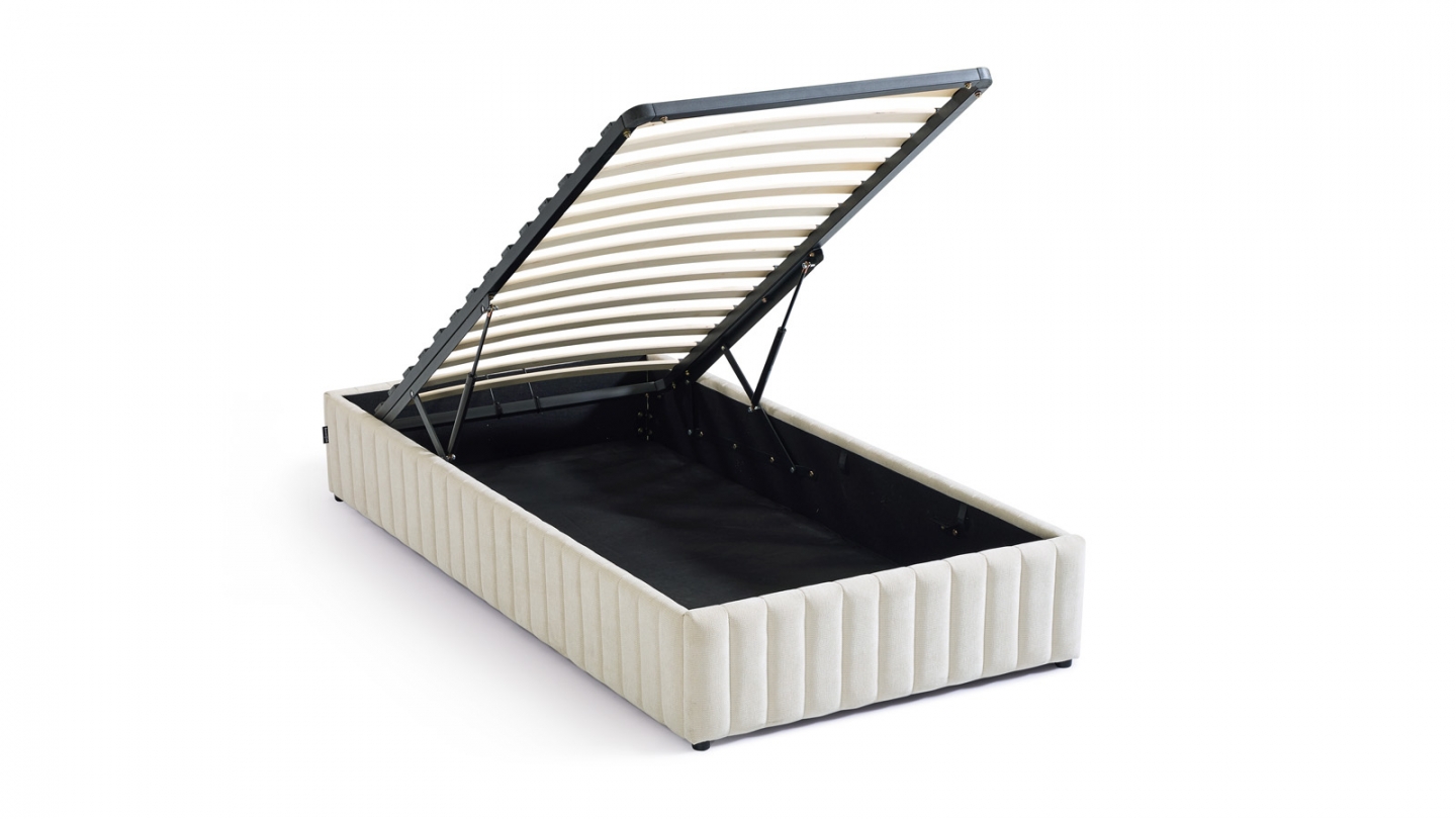 • Sommier 14 lattes en bois de Peuplier (ép. 10 mm). Espacement entre les lattes : 70 mm. Système d'ouverture à vérins hydrauliques.