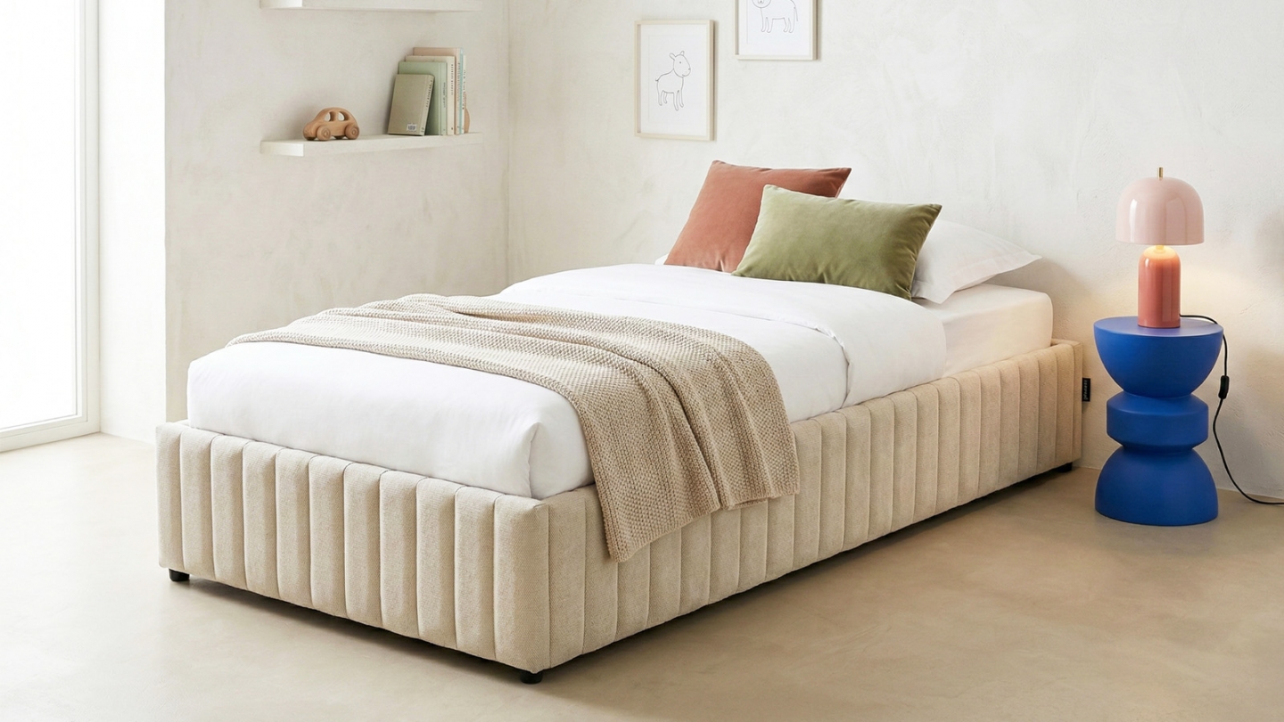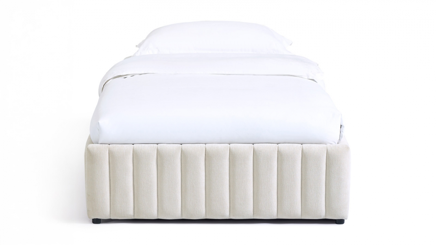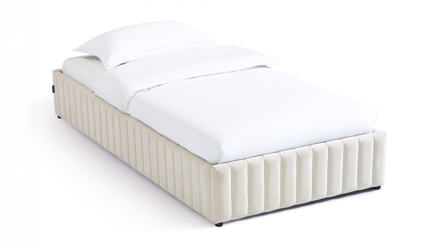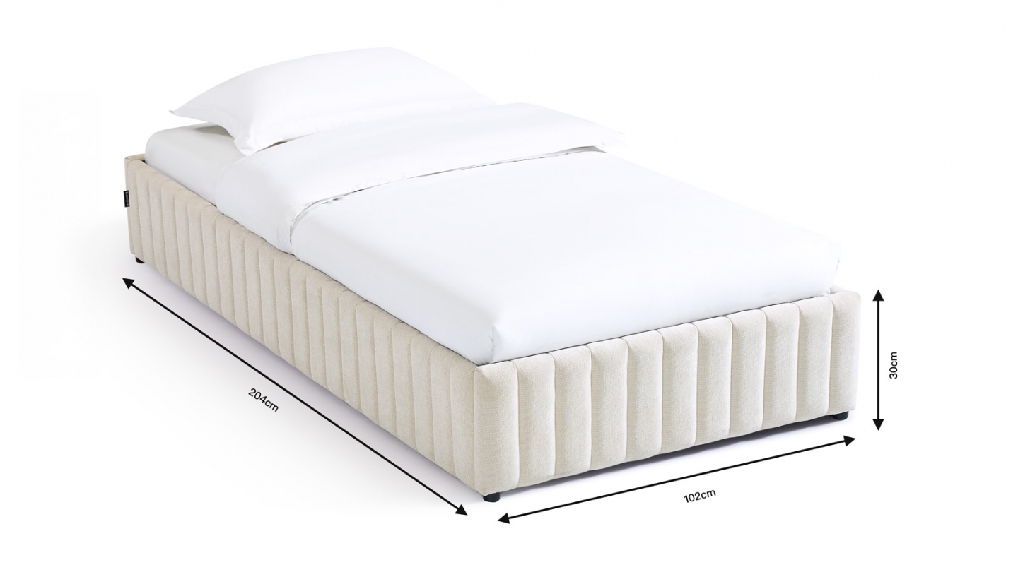 En stockLit coffre en tissu chenille - Balto• Structure : Contreplaqué• Revêtement : Tissu chenille 310 g/m² certifié Oeko-Tex®• Couleur : Beige• Garnissage : Mousse• Sommier 28 lattes en bois de Peuplier (ép. 10 mm). Espacement entre les lattes : 70 mm. Système d'ouverture à vérins hydrauliques.• Dimensions du couchage : 140 x 190 cm• Dimensions totales : 201 x...