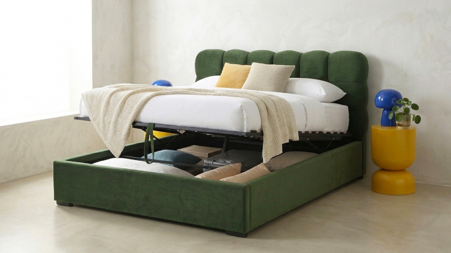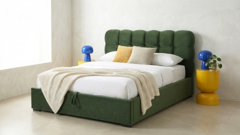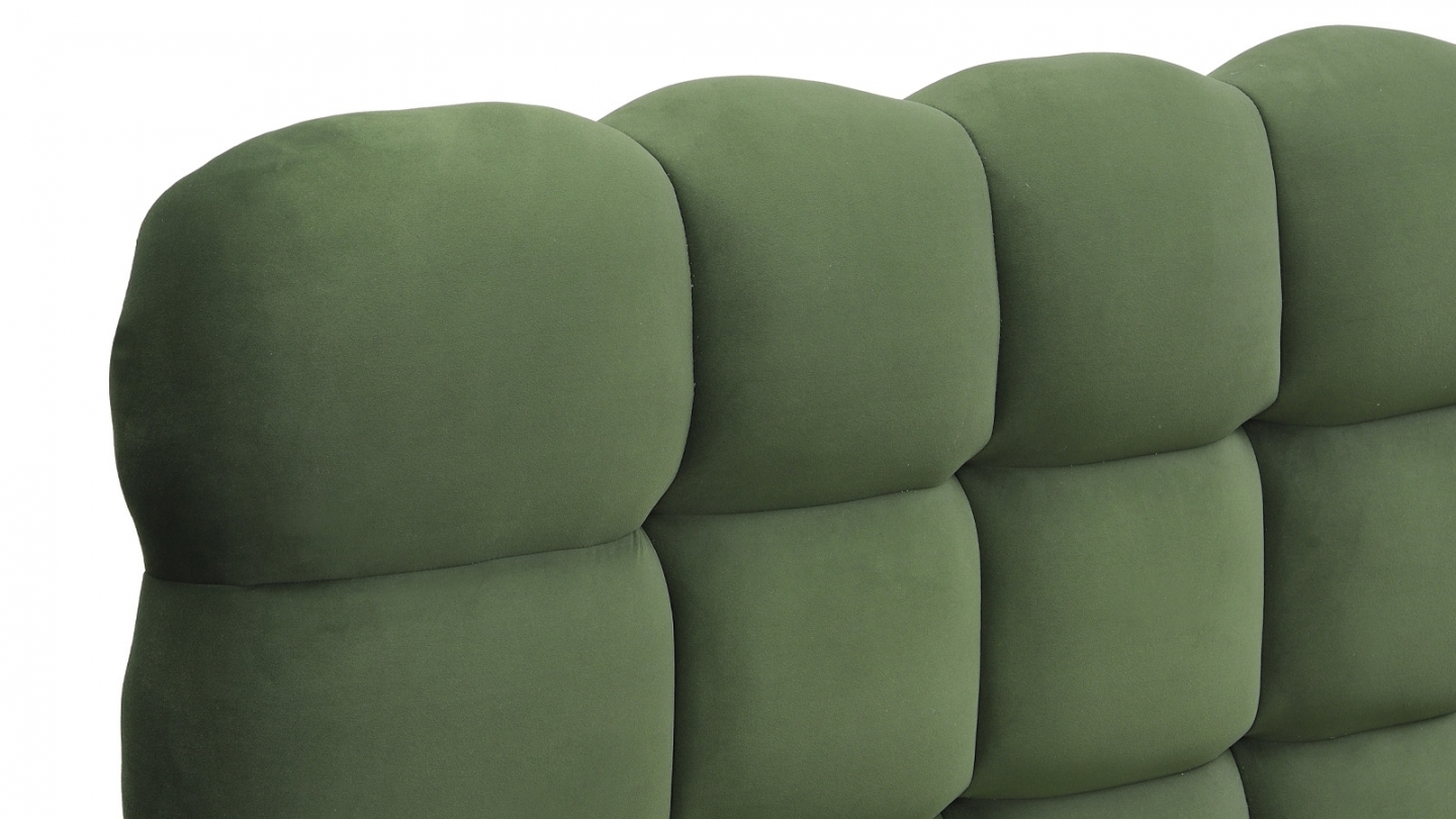 Revêtu d'un velours kaki doux et résistant, ce lit de 140x190 offre un confort optimal grâce à son garnissage en mousse. Le sommier à lattes, associé à un système d'ouverture par vérins, vous permet d'accéder facilement au spacieux coffre de rangement. Vous pourrez y ranger tout ce qui vous encombre.