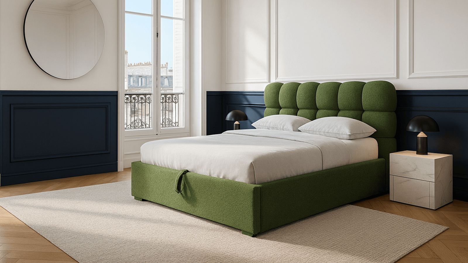Lit coffre en velours - Lola• Structure : Bois massif et MDF• Revêtement : Velours 240 g/m²• Couleur : Vert kaki• Garnissage : Mousse• Sommier coffre à lattes. Système d'ouverture à vérins• Dimensions du couchage : 160 x 200 cm• Dimensions totales : 186 x 225 x 110 cm• Dimensions du coffre de rangement : 160 x 200 cm• Dimensions de la tête de lit :...
