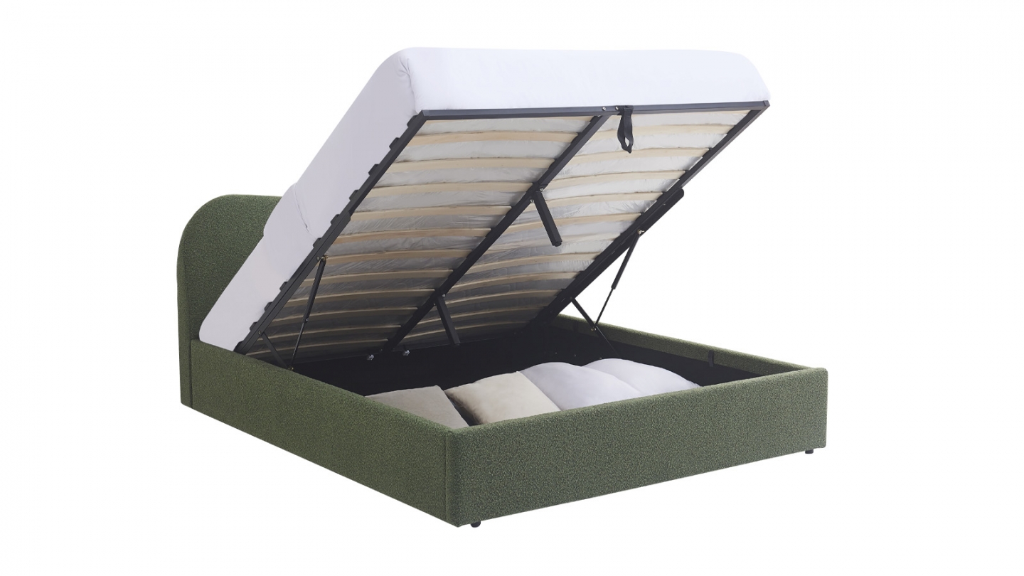 Lit coffre avec tête de lit arrondie en tissu bouclé - Suzon • Coloris : Beige • Revêtement : Tissu bouclé • Tête de lit arrondie intégrée • Structure robuste : MDF + bois massif – pour une excellente durabilité • Sommier coffre pratique avec vérins – accès facile au rangement intégré • 24 lattes pour un bon maintien du matelas • Couchage 180 x 200...