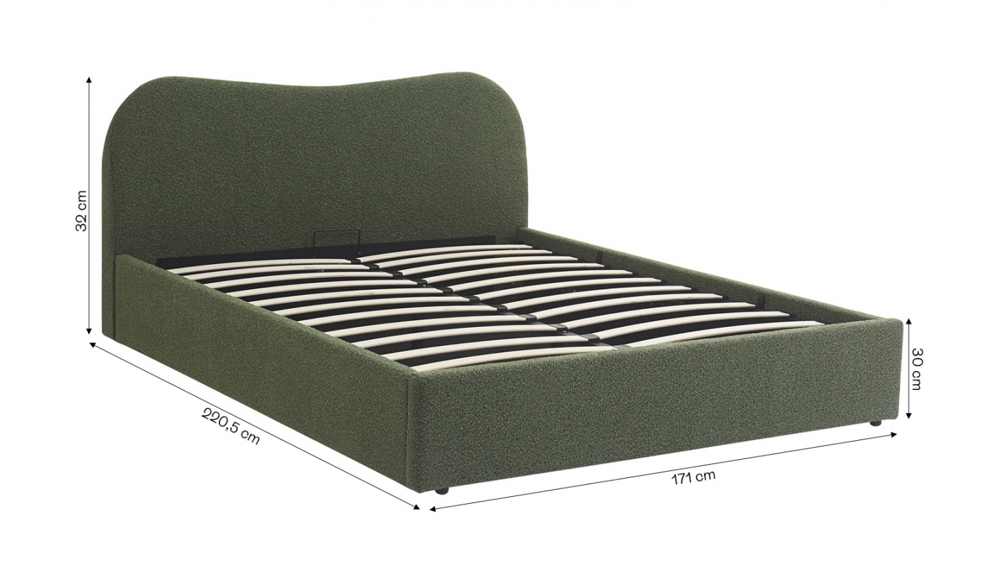Lit coffre avec tête de lit arrondie en velours - Suzon• Structure : MDF, bois massif• Revêtement : Velours 240 g/m²• Couleur : Vert clair• Avec tête de lit matelassée + sommier• Garnissage : Mousse de polyuréthane 22 kg/m3• Sommier coffre - 24 lattes - avec vérins• Dimensions du couchage : 160 x 200 cm• Dimensions totales : 220,5 x 171 x 96 cm•...