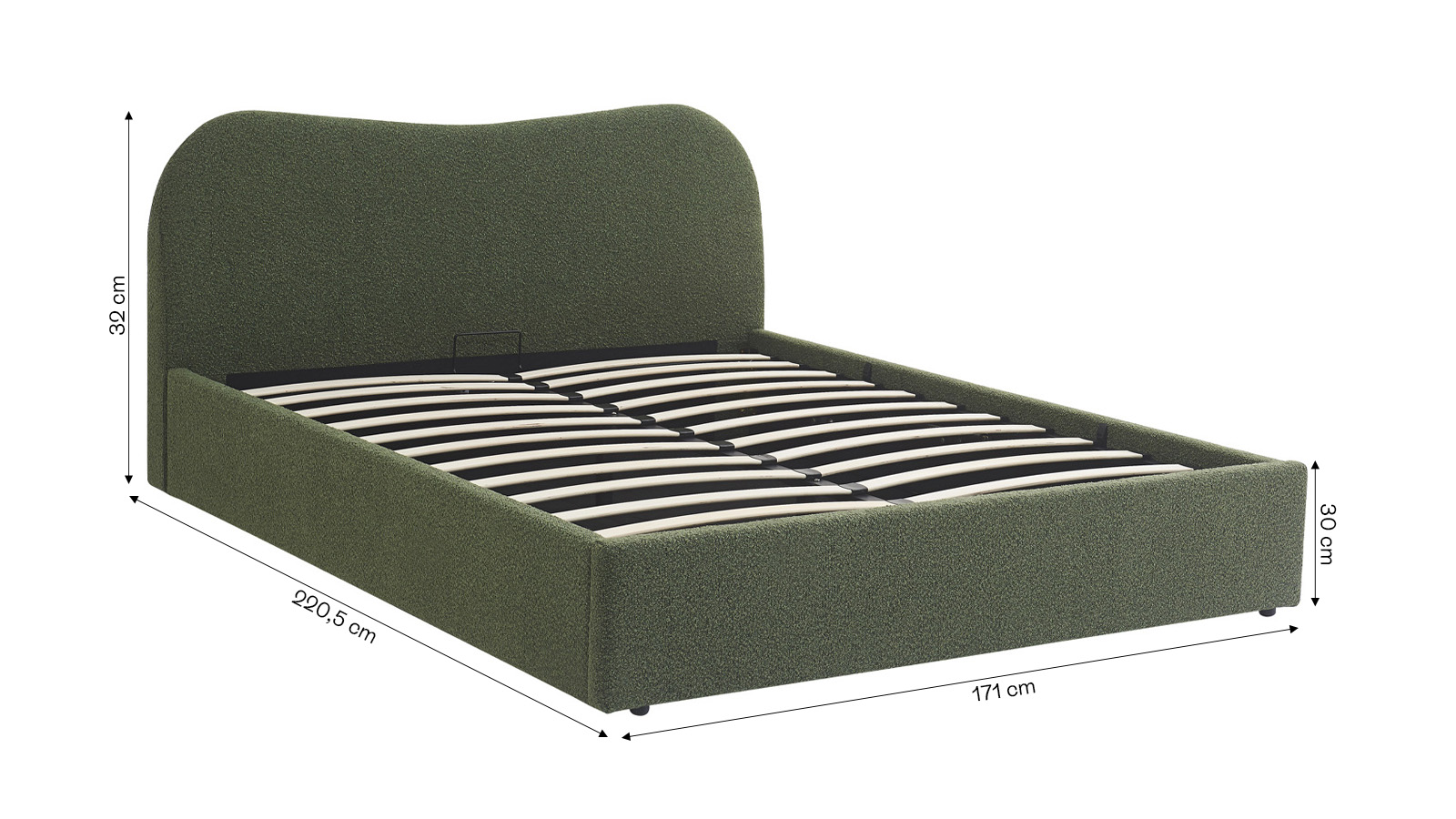 Lit coffre en velours côtelé - Tina• Structure : Contreplaqué issu de bois FSC, métal• Revêtement : Velours côtelé 380 g/m² certifié Oekotex• Couleur : Vert• Avec sommier relevable à lattes et tête de lit• Garnissage : Mousse• Sommier 39 lattes (53x9 mm) en bois de peuplier• Dimensions du couchage : 180 x 200 cm• Dimensions totales : 215 x 190 x 88 cm•...