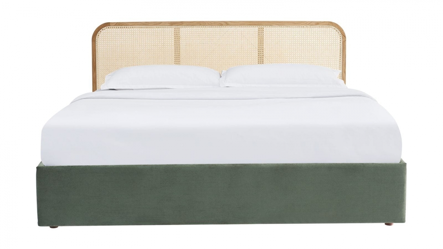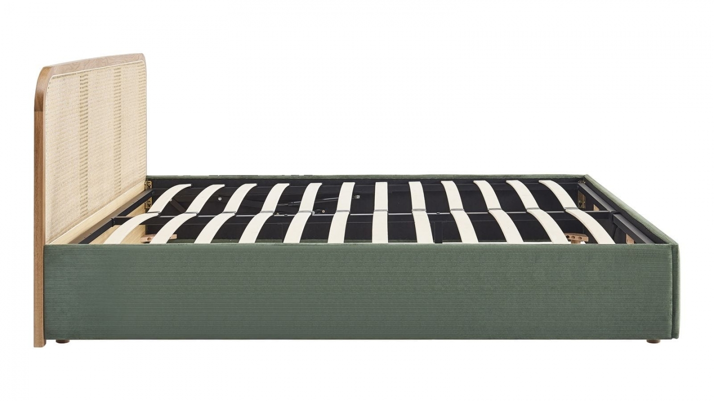 En stockLit coffre en velours côtelé - Elsa• Structure : Bois, MDF - Tête de lit en frêne massif peint et cannage• Revêtement : Velours côtelé certifié Oeko-Tex• Couleur : Vert• Avec sommier à lattes, tête de lit et coffre de rangement• Sommier à lattes passives• Dimensions du couchage : 180 x 200 cm• Dimensions totales : 208 x 188 x 90 cm• Poids net : 37 kg•...