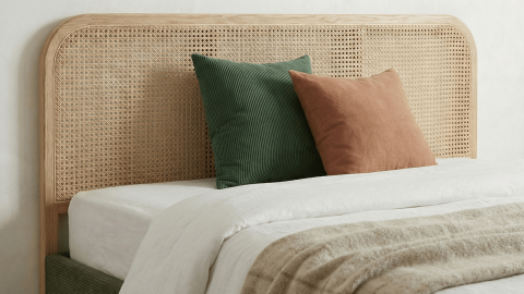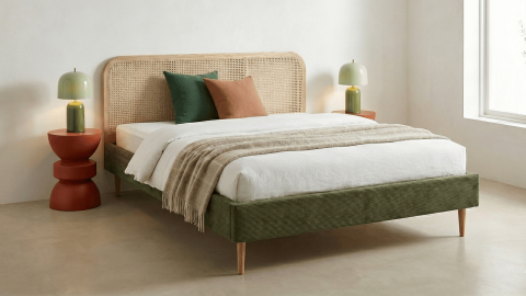 Optez pour l'un des deux coloris intemporels, vert kaki ou beige, et créez une ambiance apaisante et sophistiquée, sublimée par une tête de lit en cannage qui ajoute une touche de charme supplémentaire !