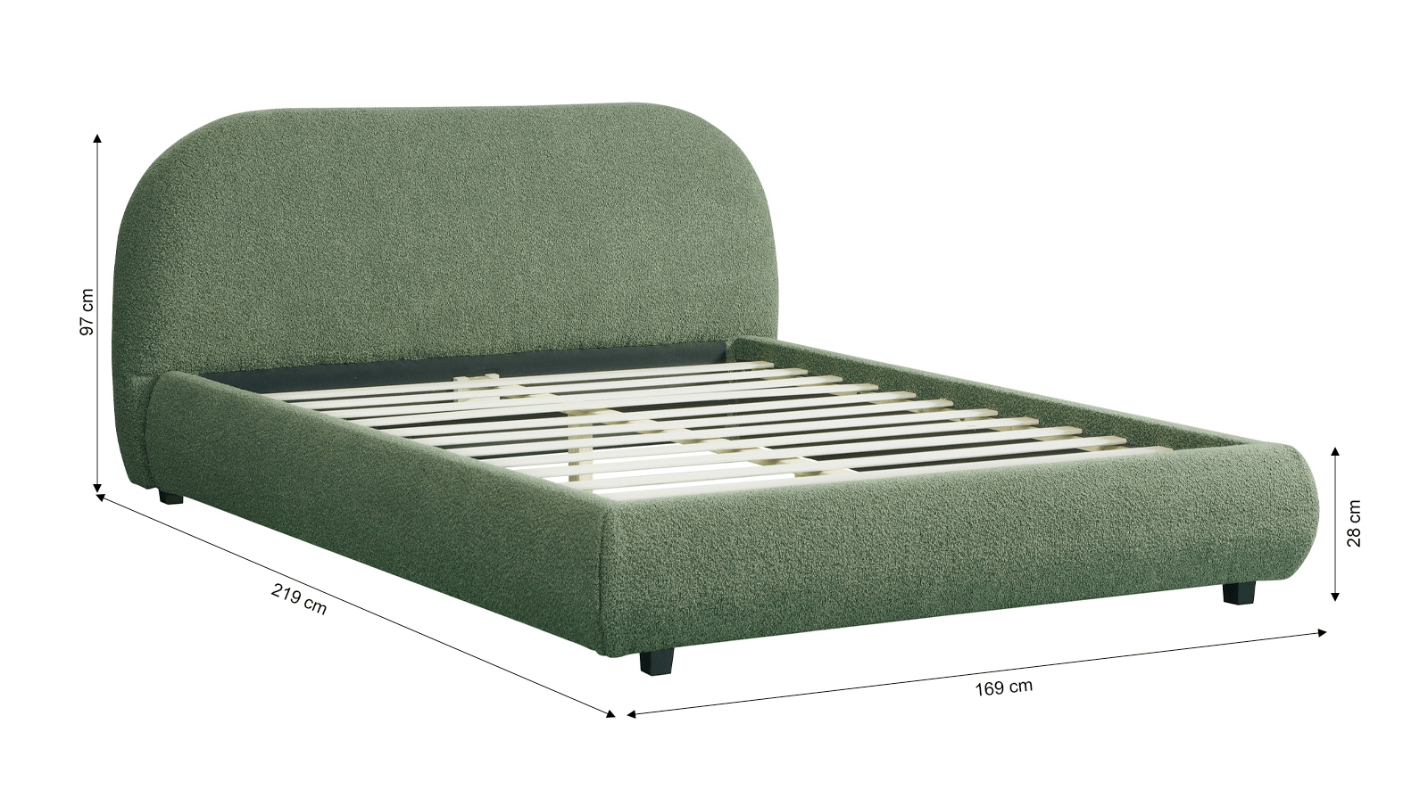 Lit en tissu bouclé - Maddie• Structure : MDF• Revêtement : Tissu bouclé• Couleur : Vert kaki• Sommier à lattes• Dimensions du couchage : 160 x 200 cm• Dimensions totales : 180 x 227 x 96 cm• Hauteur du cadre de lit : 28 cm