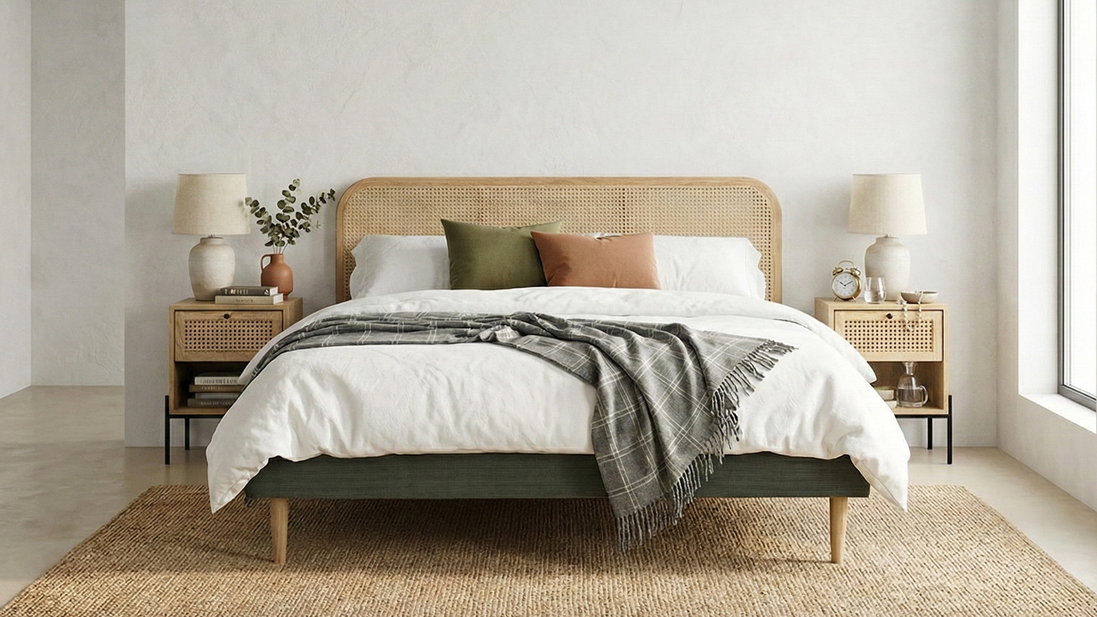 • Lit avec tête de lit en cannage naturel • Sommier recouvert de velours côtelé• Revêtement : Velours côtelé• Couleur : Kaki• Sommier 24 lattes inclus• Structure : Frêne massif, placage chêne• Dimension de couchage : 160 x 200 cm• Hauteur des pieds : 19 cm - Naturel• Dimensions totales : 206 x 167 x 90 cm