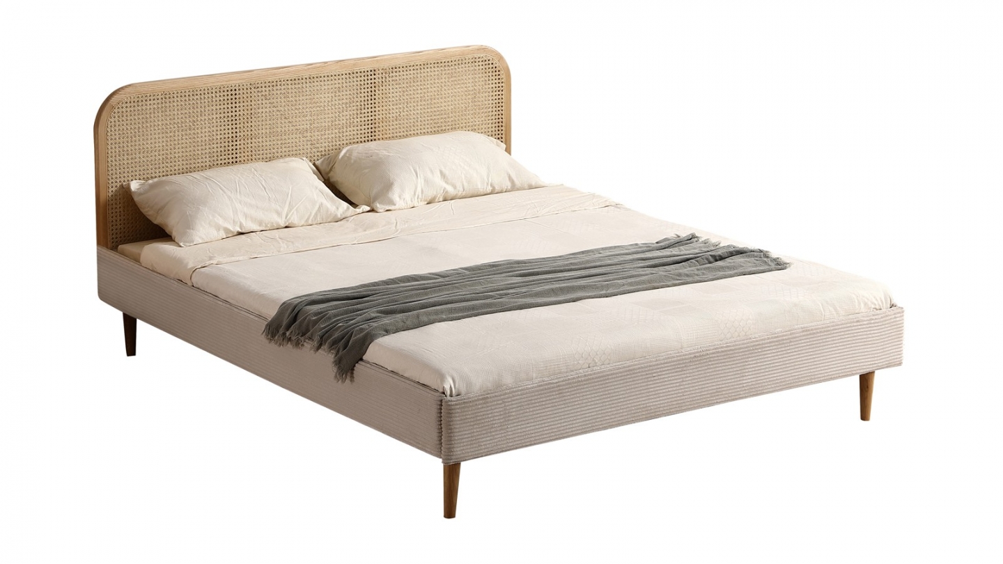 • Lit avec tête de lit en cannage naturel • Sommier recouvert de velours côtelé• Revêtement : Velours côtelé• Couleur : Beige• Sommier 24 lattes inclus• Structure : Frêne massif, placage chêne• Dimension de couchage : 160 x 200 cm• Hauteur des pieds : 19 cm - Naturel• Dimensions totales : 206 x 167 x 90 cm