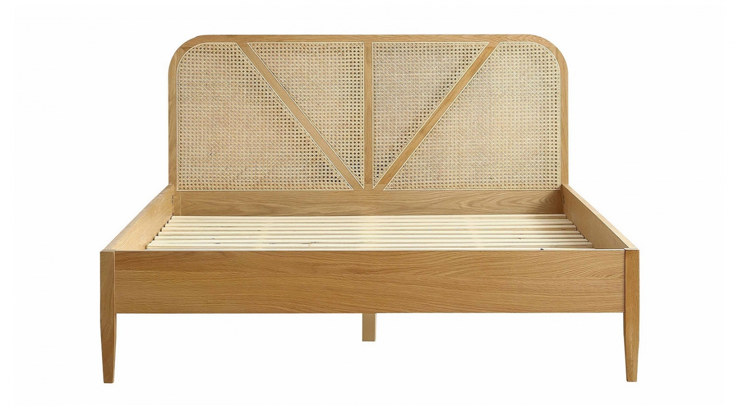 • Lit adulte en chêne et tête de lit en cannage naturel • Sommier à lattes en bois contreplaqué • Cadre de la tête de lit en chêne massif avec cannage naturel • Couleur : chêne naturel • Pieds en chêne massif - hauteur 19 cm • Hauteur du pied + cadre : 36 cm • Dimensions de couchage : 160x200 • Dimensions totales : 208 x 164,5 x 90 cm