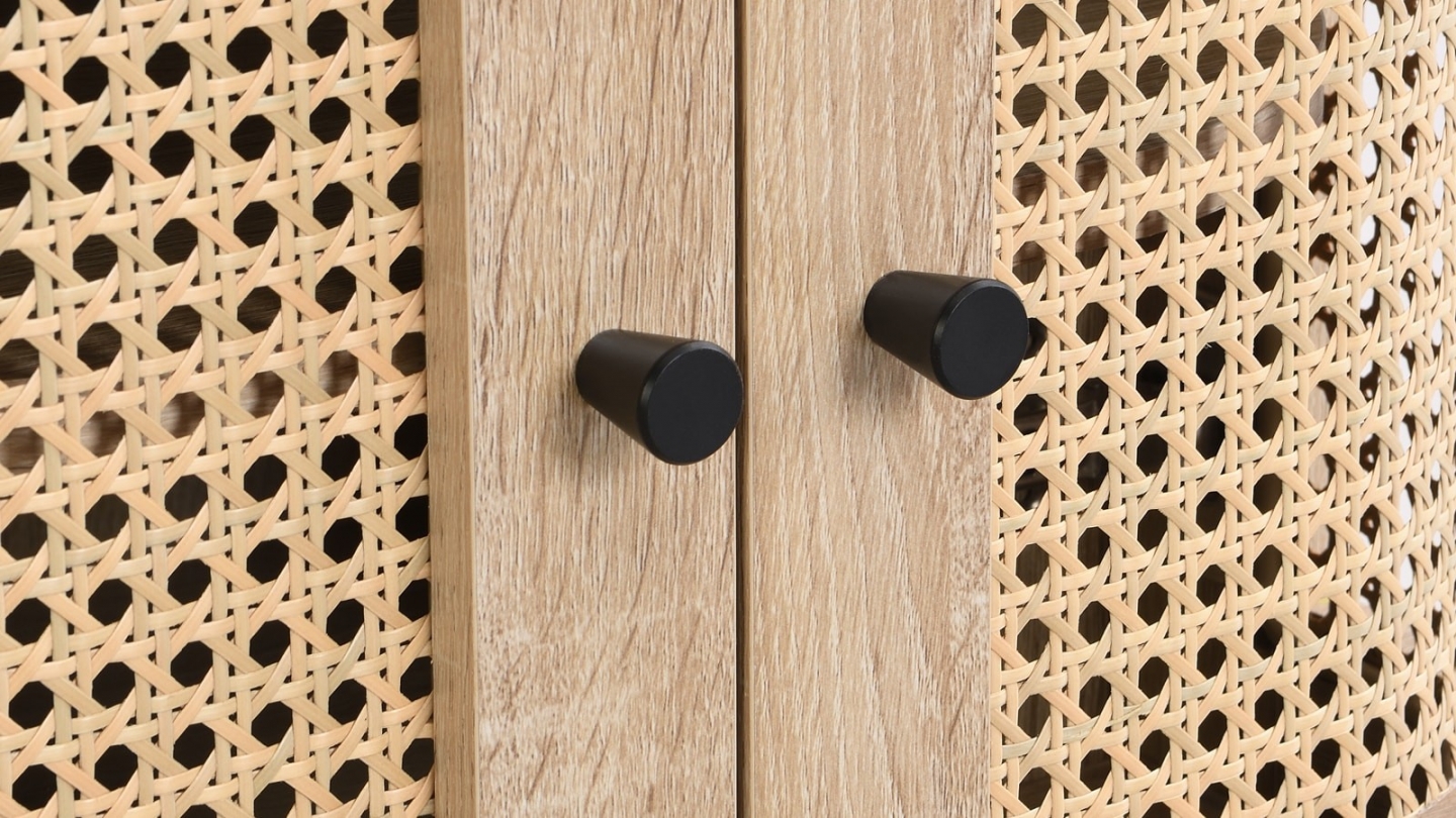 • Lit adulte en chêne et tête de lit en cannage naturel • Sommier à lattes en bois contreplaqué • Cadre de la tête de lit en chêne massif avec cannage naturel • Couleur : chêne naturel • Pieds en chêne massif - hauteur 19 cm • Hauteur du pied + cadre : 36 cm • Dimensions de couchage : 180x200 • Dimensions totales : 208 x 184,5 x 90 cm