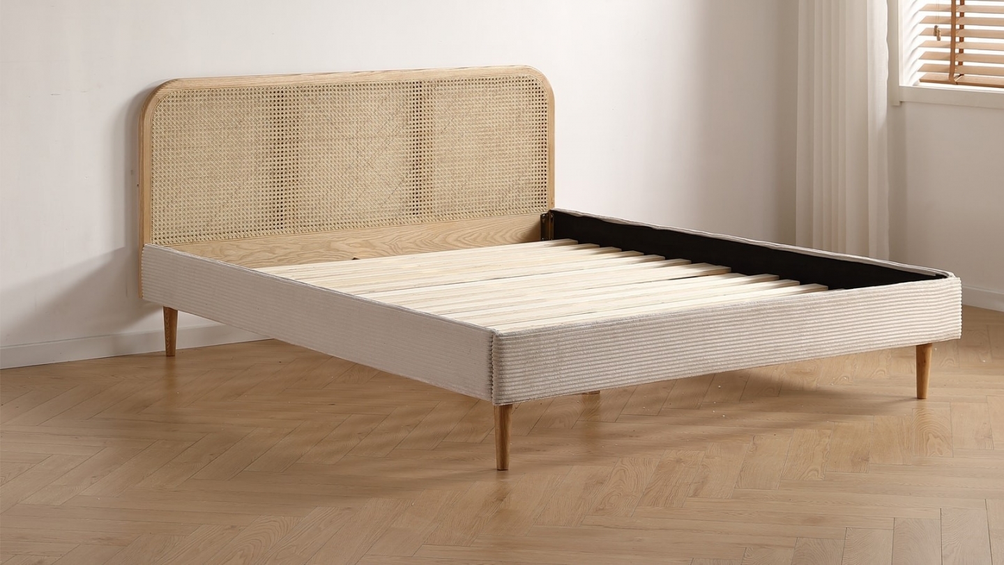 • Lit avec tête de lit en cannage naturel • Sommier recouvert de velours côtelé• Revêtement : Velours côtelé• Couleur : Beige• Sommier 24 lattes inclus• Structure : Frêne massif, placage chêne• Dimension de couchage : 160 x 200 cm• Hauteur des pieds : 19 cm - Naturel• Dimensions totales : 206 x 167 x 90 cm