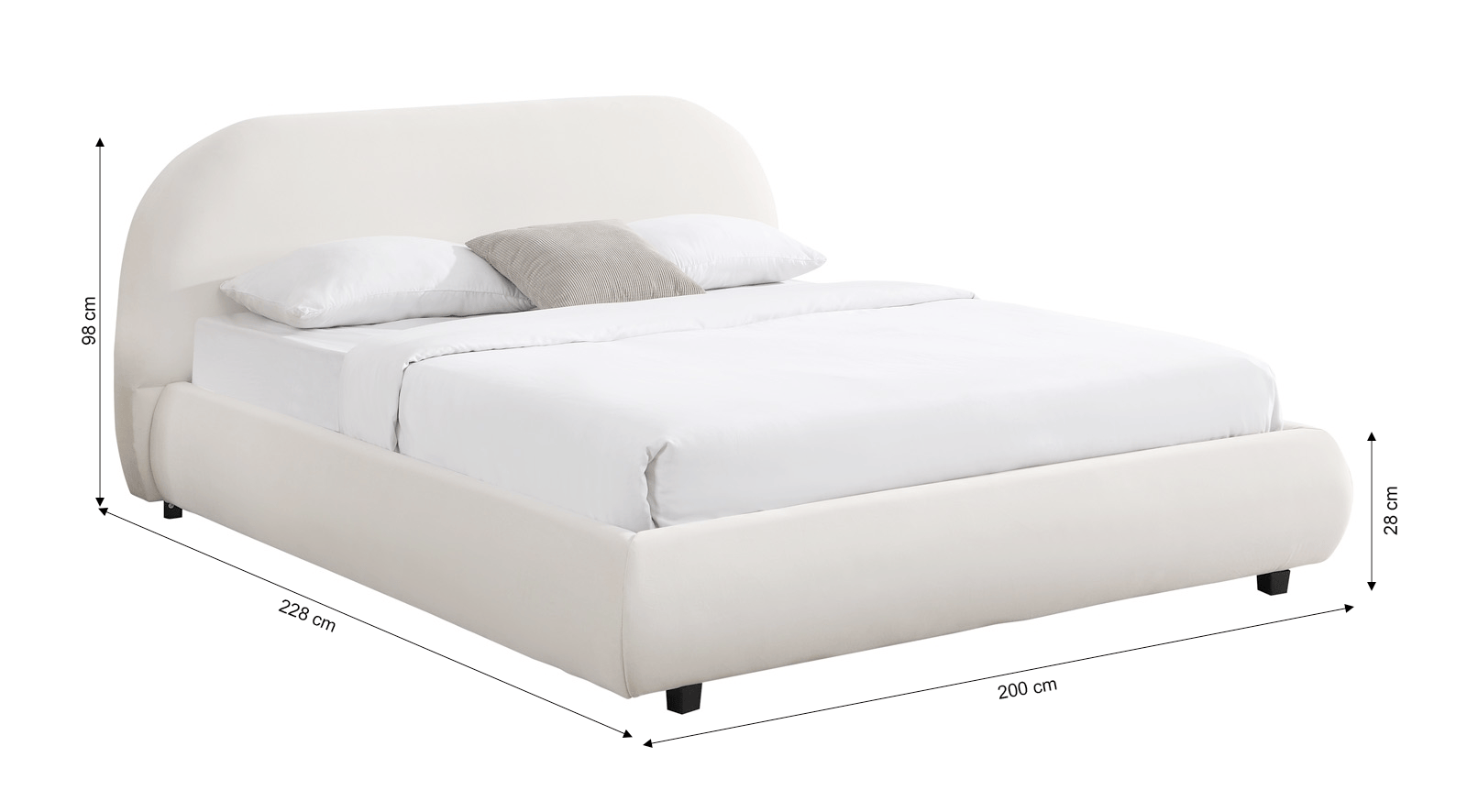 Lit en tissu bouclé - Maddie• Structure : Bois massif et MDF• Revêtement : Tissu bouclé 600 g/m²• Couleur : Beige• Garnissage : Mousse• Sommier à lattes• Dimensions du couchage : 180 x 200 cm• Dimensions totales : 228 x 200 x 98 cm • Dimensions de la tête de lit : 200x11x98 cm• Hauteur du cadre de lit : 28 cm