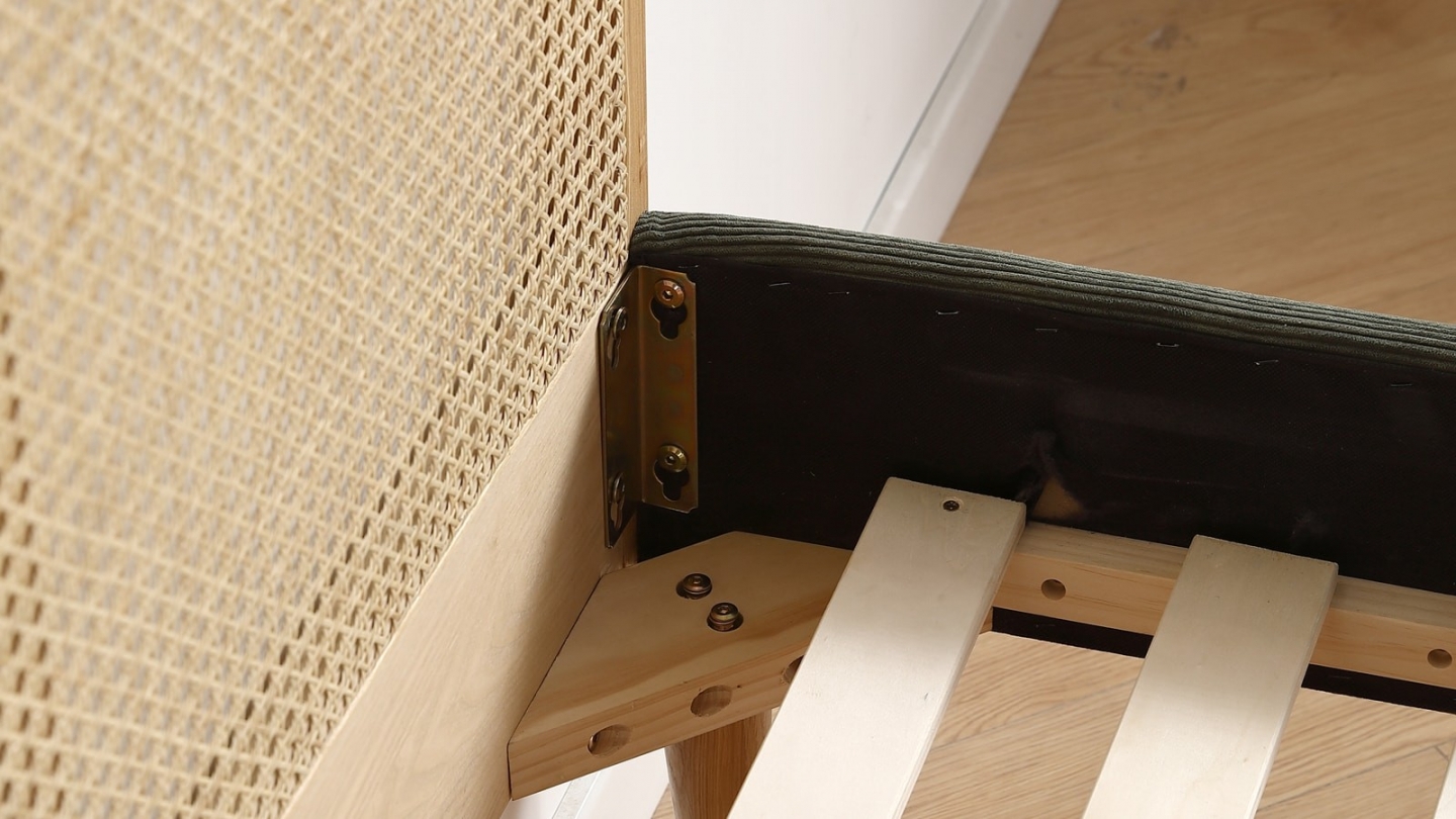 • Lit avec tête de lit en cannage naturel • Sommier recouvert de velours côtelé• Revêtement : Velours côtelé• Couleur : Kaki• Sommier 24 lattes inclus• Structure : Frêne massif, placage chêne• Dimension de couchage : 160 x 200 cm• Hauteur des pieds : 19 cm - Naturel• Dimensions totales : 206 x 167 x 90 cm
