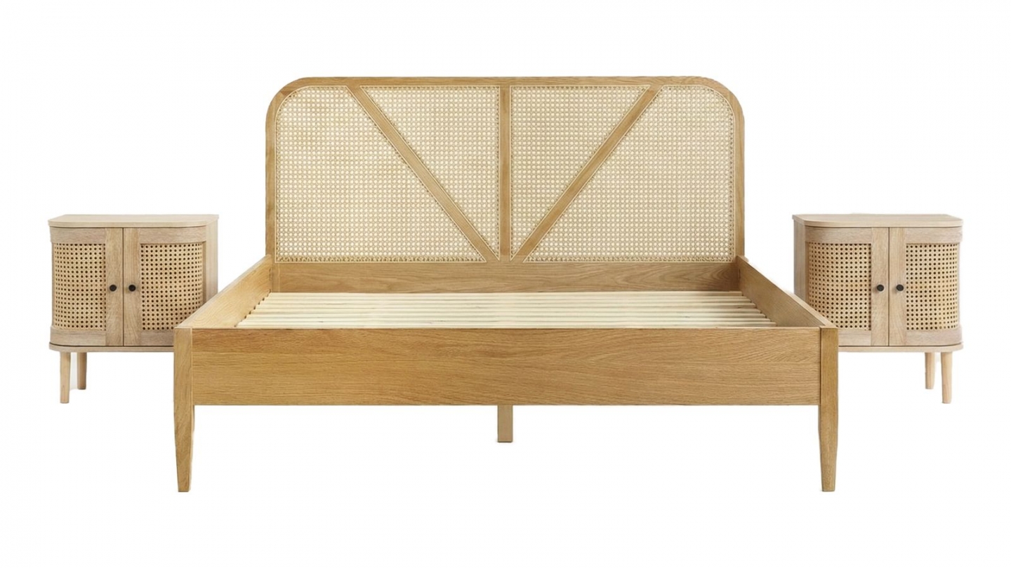 • Lit adulte en chêne et tête de lit en cannage naturel • Sommier à lattes en bois contreplaqué • Cadre de la tête de lit en chêne massif avec cannage naturel • Couleur : chêne naturel • Pieds en chêne massif - hauteur 19 cm • Hauteur du pied + cadre : 36 cm • Dimensions de couchage : 180x200 • Dimensions totales : 208 x 184,5 x 90 cm