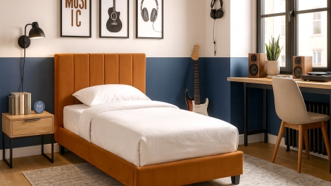 Le sommier à 12 lattes offre un soutien adapté pour un matelas 90x190 cm, et le garnissage en mousse polyuréthane de 22 kg/m³ ajoute une touche de confort appréciable au quotidien. Sa structure basse, avec un cadre de lit à 12 cm de hauteur et un piètement noir discret de 5 cm, donne un look contemporain et aérien qui n’alourdit pas l’espace. Idéal pour les petites pièces ou les intérieurs bien pensés.
