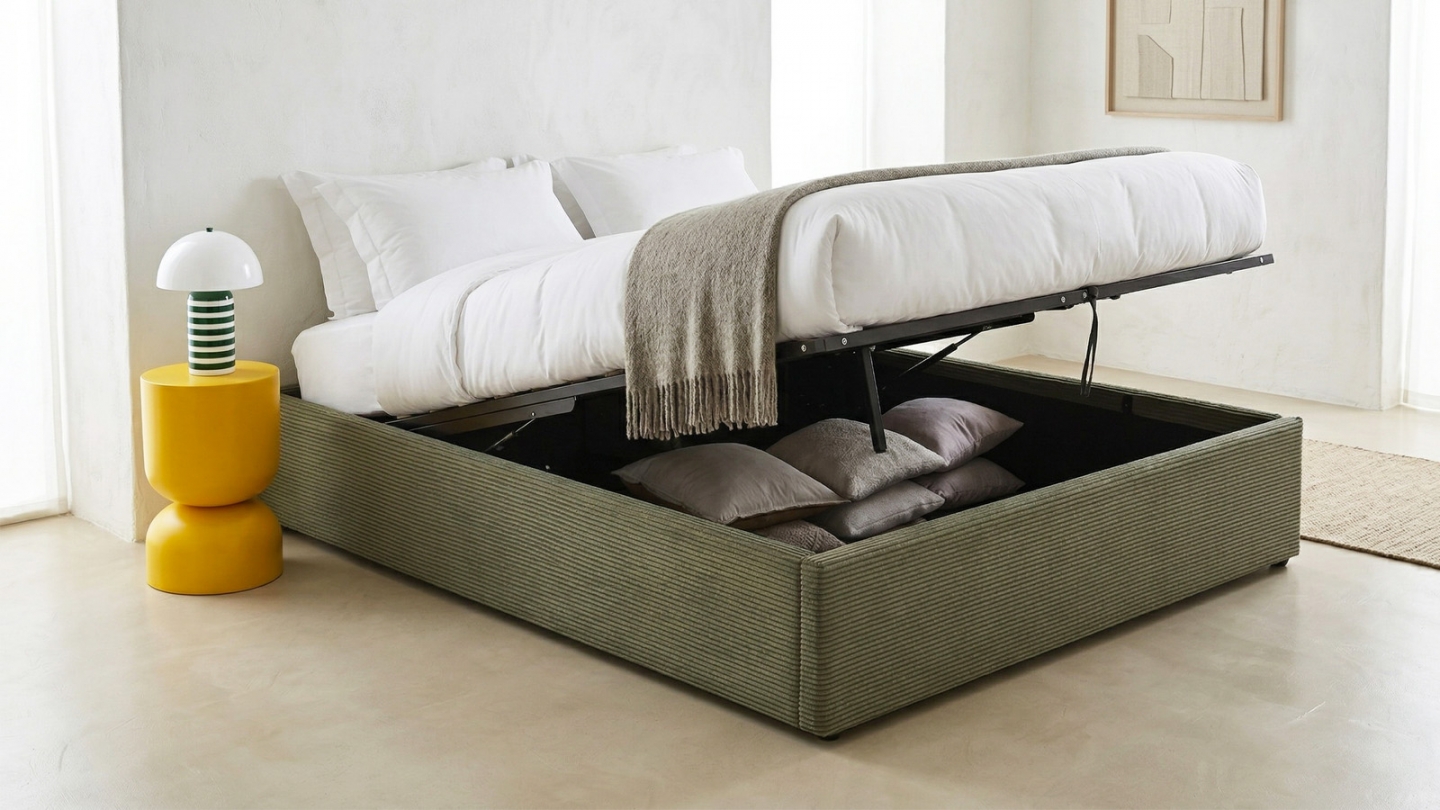 Ce système ingénieux permet d'ouvrir un vaste espace de rangement sous le lit, parfait pour organiser linge de lit, couettes, oreillers et autres objets que vous souhaitez garder à portée de main sans encombrer votre pièce.