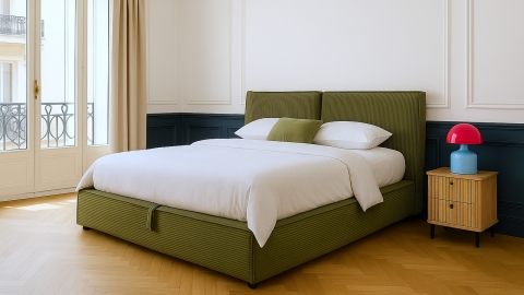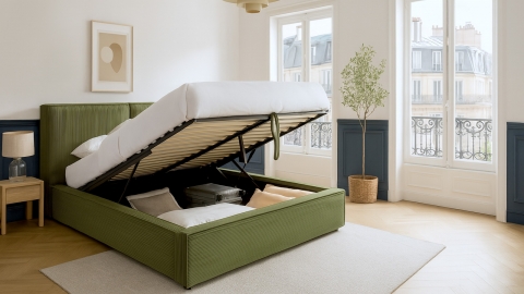 En stockLit coffre avec tête de lit rembourrée en velours côtelé - Arno• Structure : Bois massif et MDF• Revêtement : Velours côtelé 100% polyester 340 g/m² certifié Oekotex• Couleur : Vert kaki• Garnissage : Mousse• Sommier coffre à lattes. Système d'ouverture à vérins• Dimensions du couchage : 160 x 200 cm• Dimensions totales : 198 x 232 x 95 cm• Dimensions du...