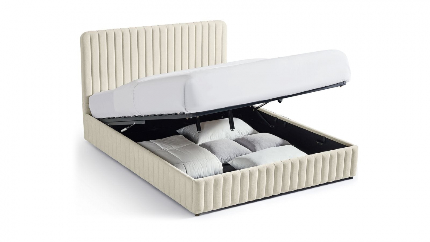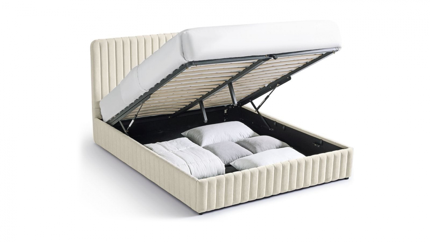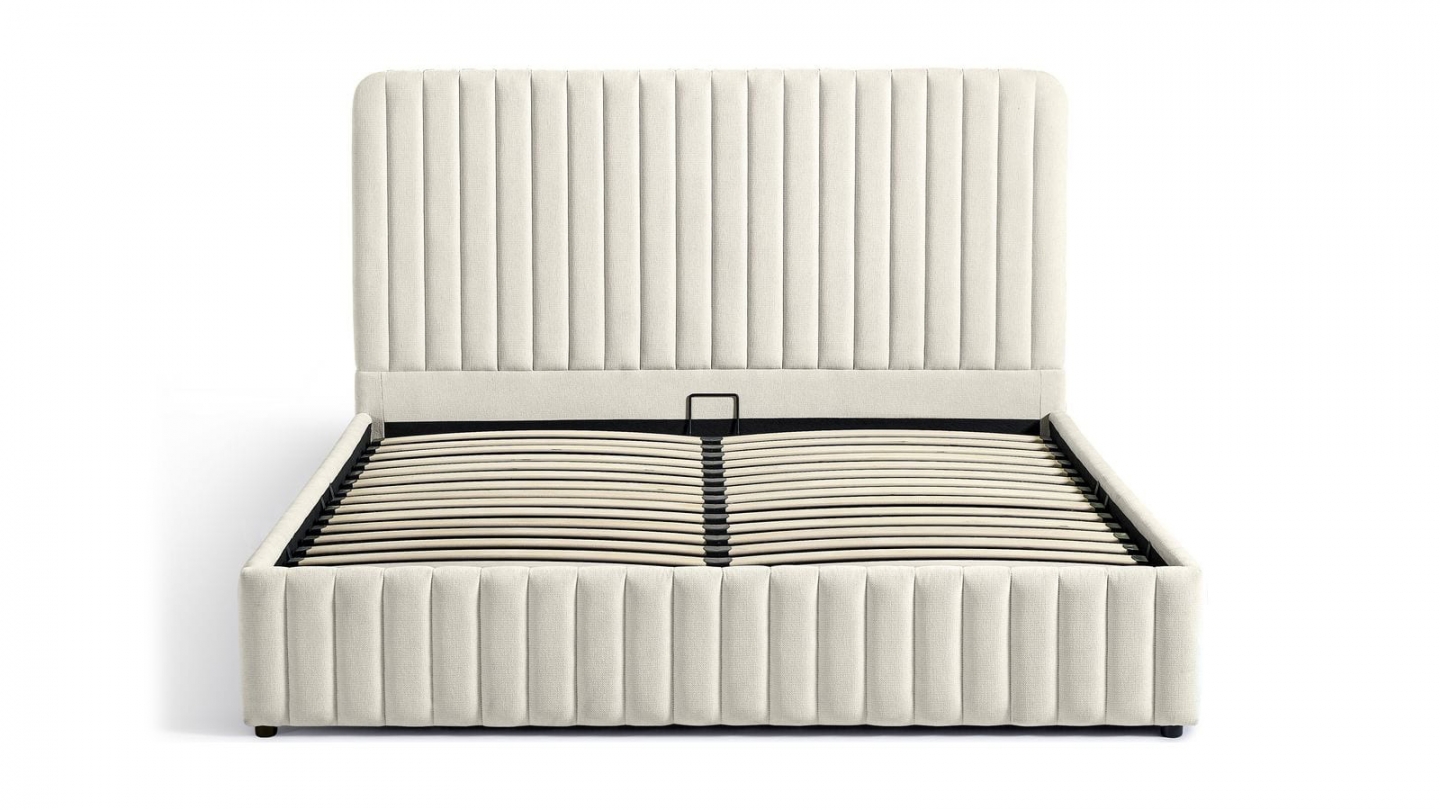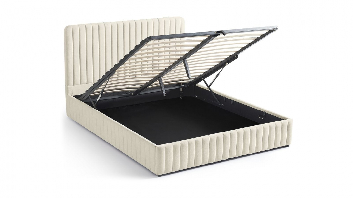 En stockLit coffre en tissu bouclé - Madisson• Structure : MDF• Revêtement : Tissu bouclé• Couleur : Beige• Sommier coffre à lattes• Dimensions du couchage : 140 x 190 cm• Dimensions totales : 219 x 169 x 96 cm• Hauteur du cadre de lit : 28 cm