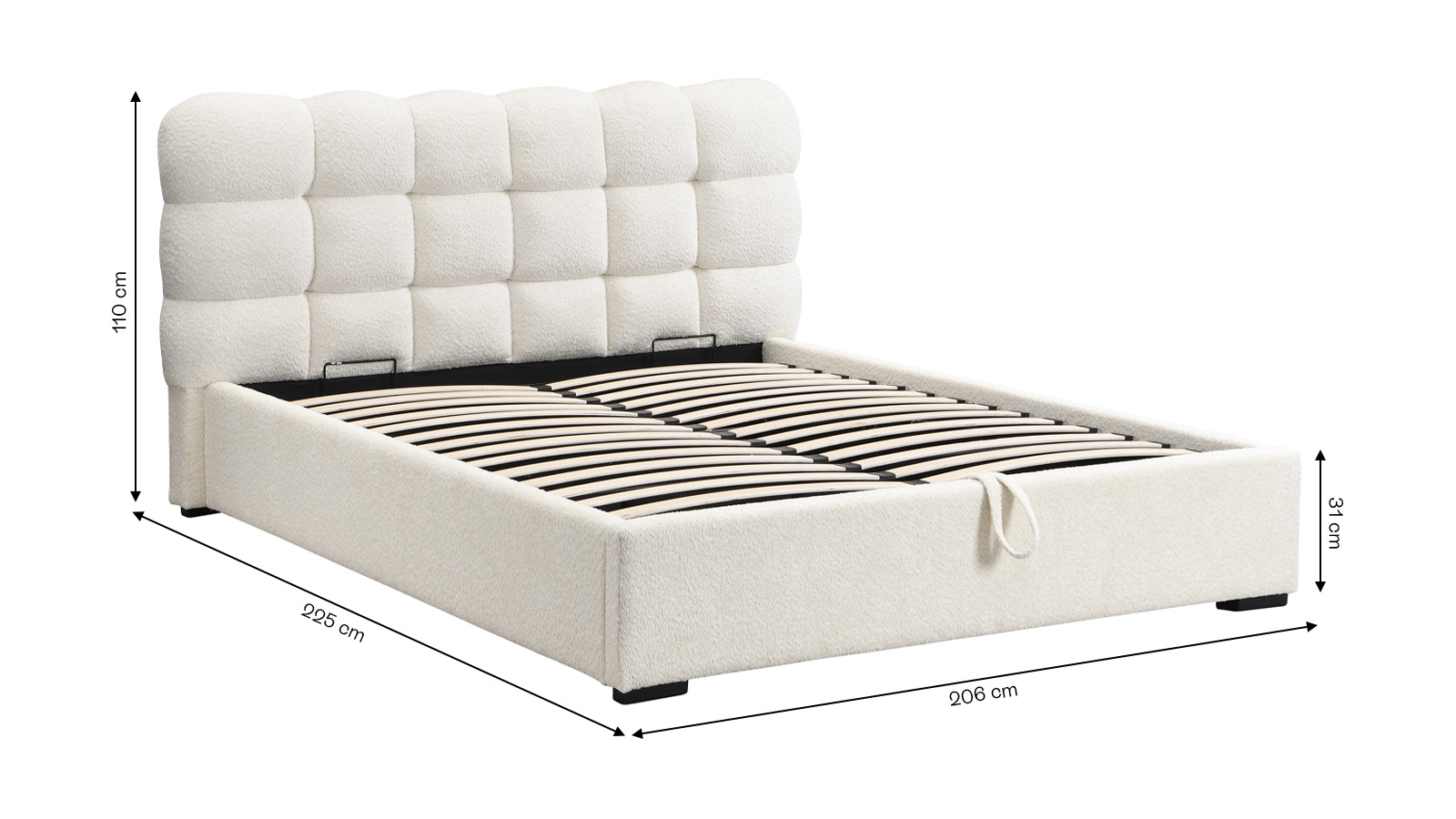 Lit coffre en tissu bouclé - Lola• Structure : Bois massif et MDF• Revêtement : Tissu bouclé 600 g/m²• Couleur : Beige• Garnissage : Mousse• Sommier coffre à lattes. Système d'ouverture à vérins• Dimensions du couchage : 140 x 190 cm• Dimensions totales : 166 x 215 x 110 cm• Dimensions du coffre de rangement : 140 x 190 cm• Dimensions de la tête de lit :...