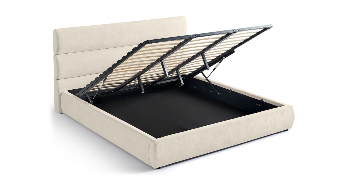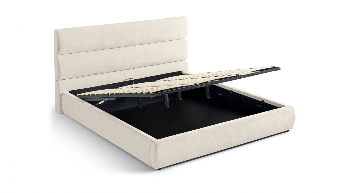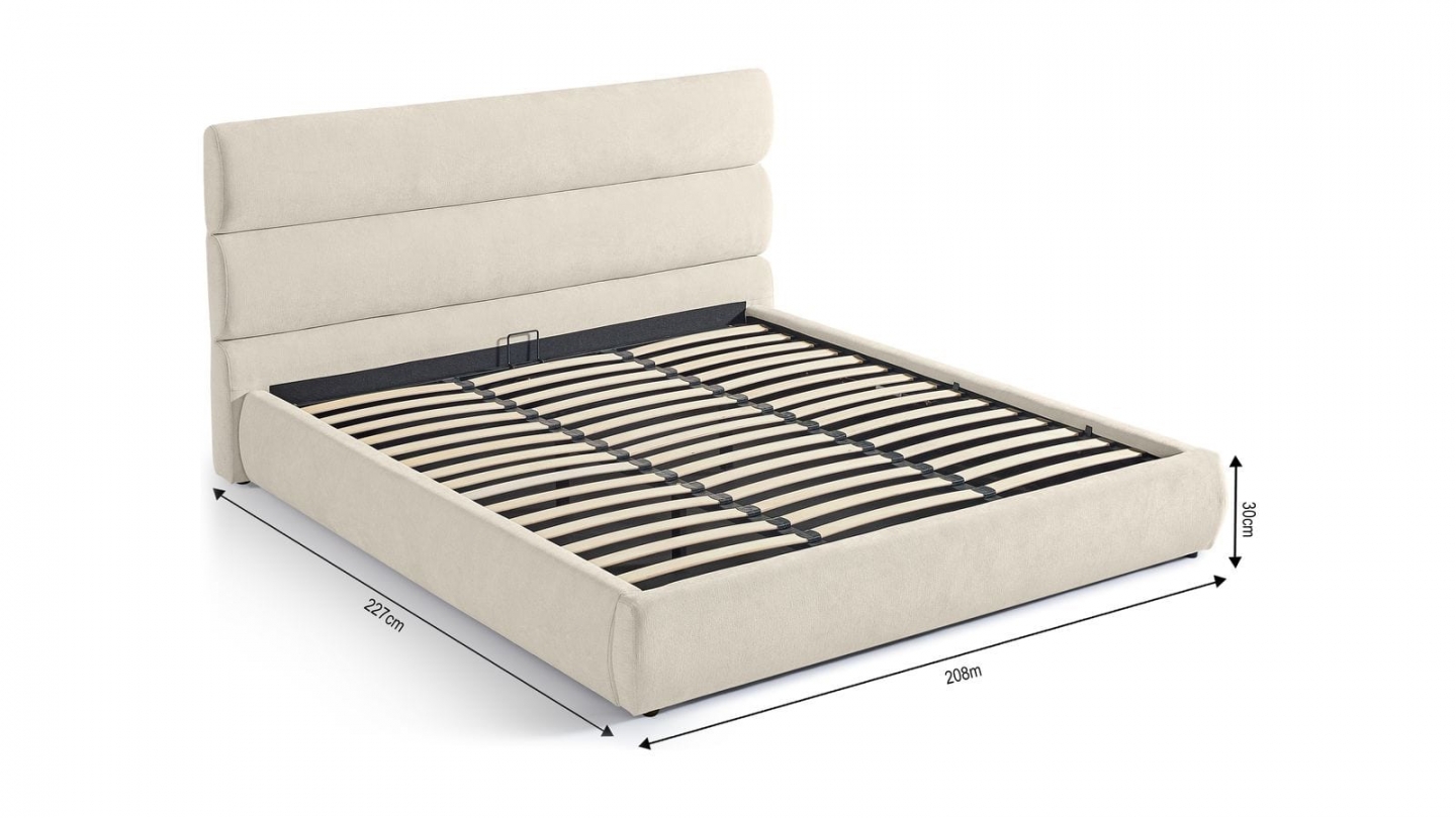 En stockLit coffre en tissu bouclé - Tina• Structure : Contreplaqué issu de bois FSC, métal• Revêtement : Tissu bouclé 530 g/m² certifié Oekotex• Couleur : Beige• Avec sommier relevable à lattes et tête de lit• Garnissage : Mousse• Sommier 39 lattes (53x9 mm) en bois de peuplier• Dimensions du couchage : 180 x 200 cm• Dimensions totales : 215 x 190 x 88 cm•...
