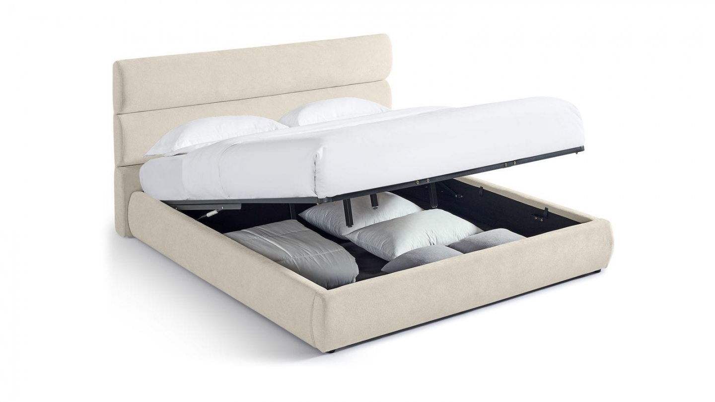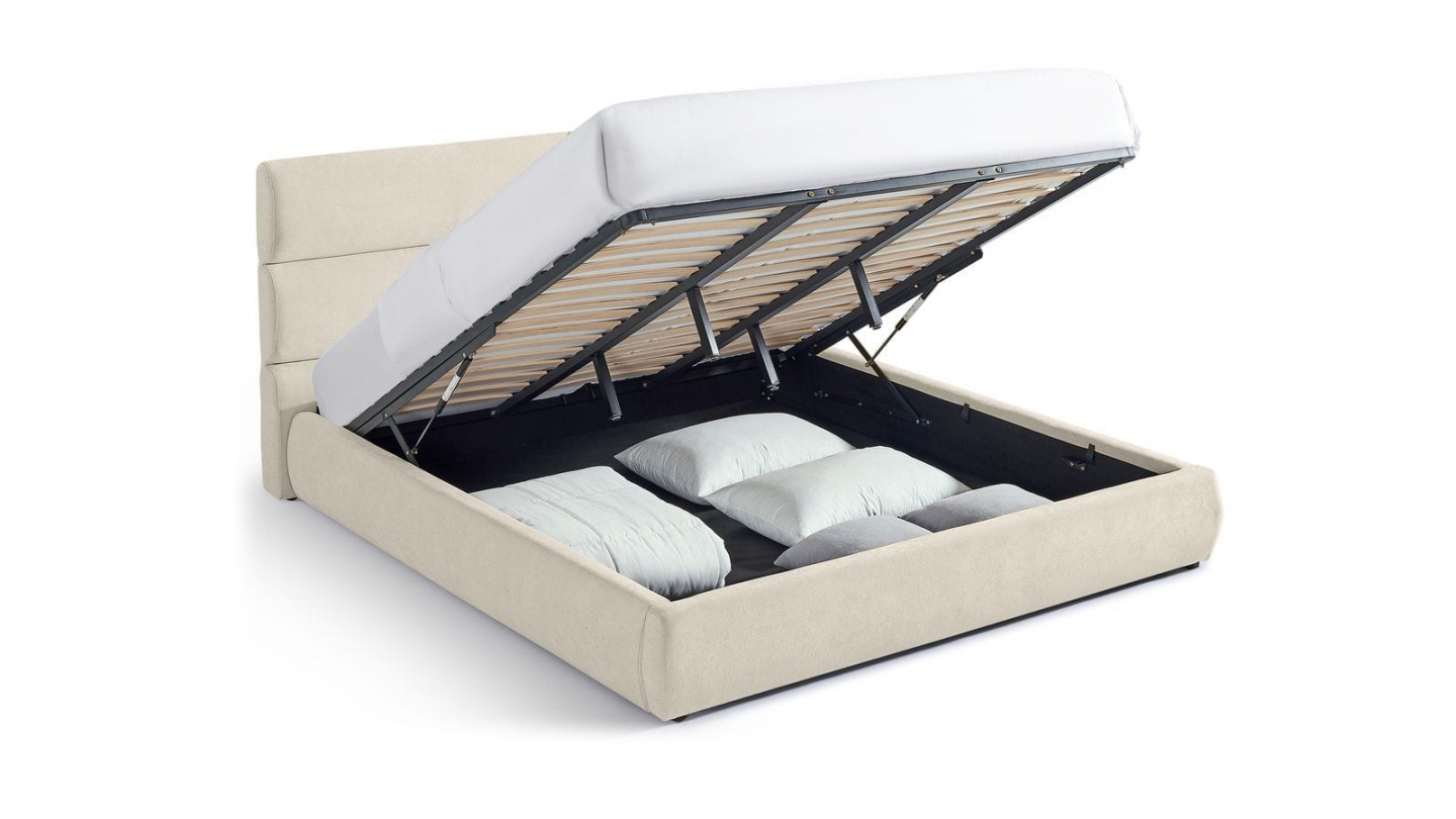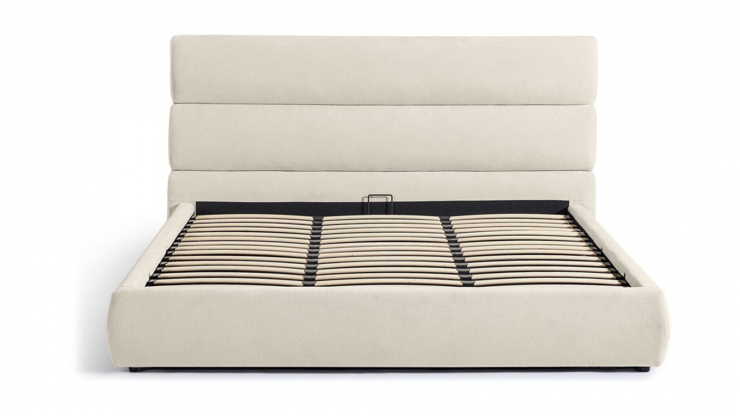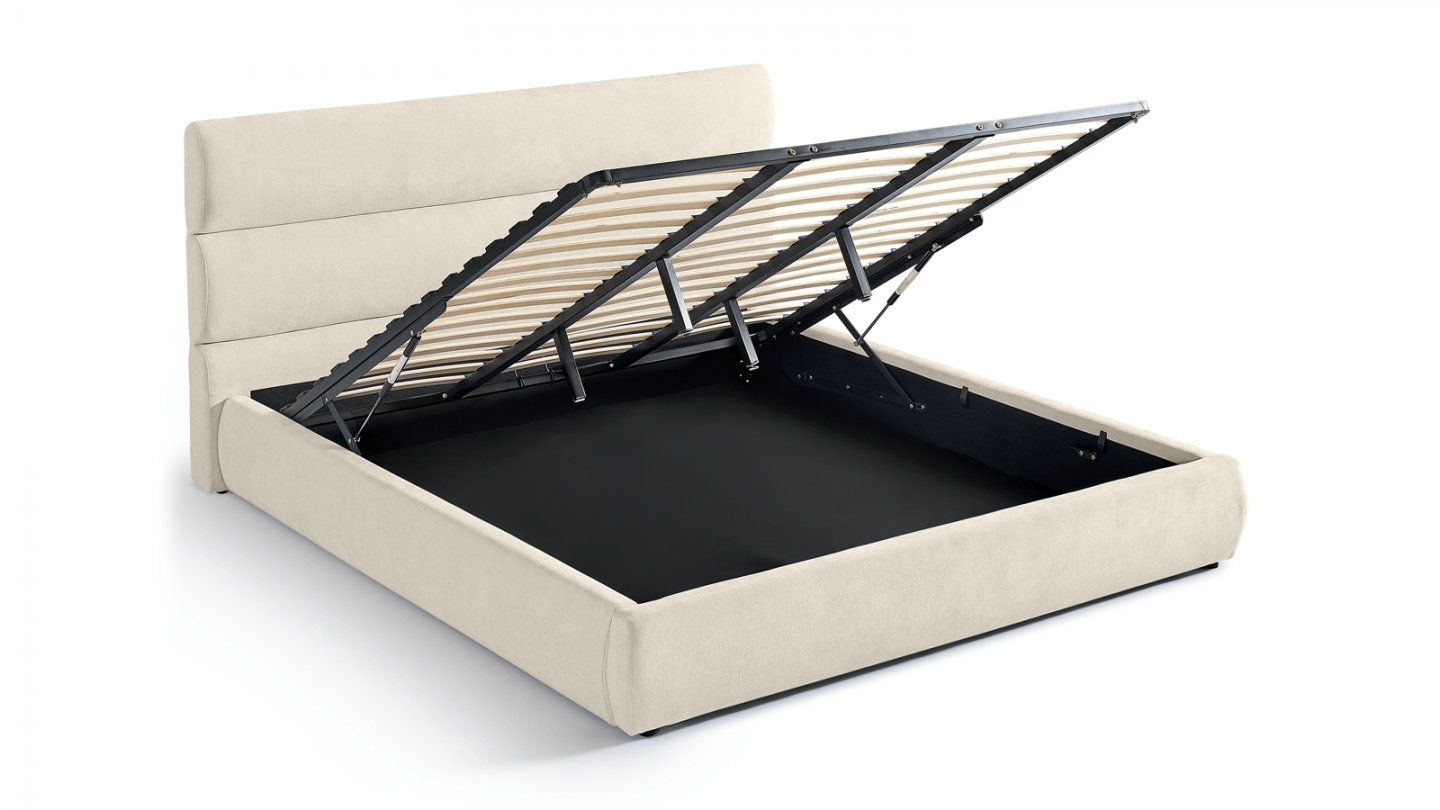 En stockLit coffre en tissu bouclé - Tina• Structure : Contreplaqué issu de bois FSC, métal• Revêtement : Tissu bouclé 530 g/m² certifié Oekotex• Couleur : Beige• Avec sommier relevable à lattes et tête de lit• Garnissage : Mousse• Sommier 39 lattes (53x9 mm) en bois de peuplier• Dimensions du couchage : 180 x 200 cm• Dimensions totales : 215 x 190 x 88 cm•...