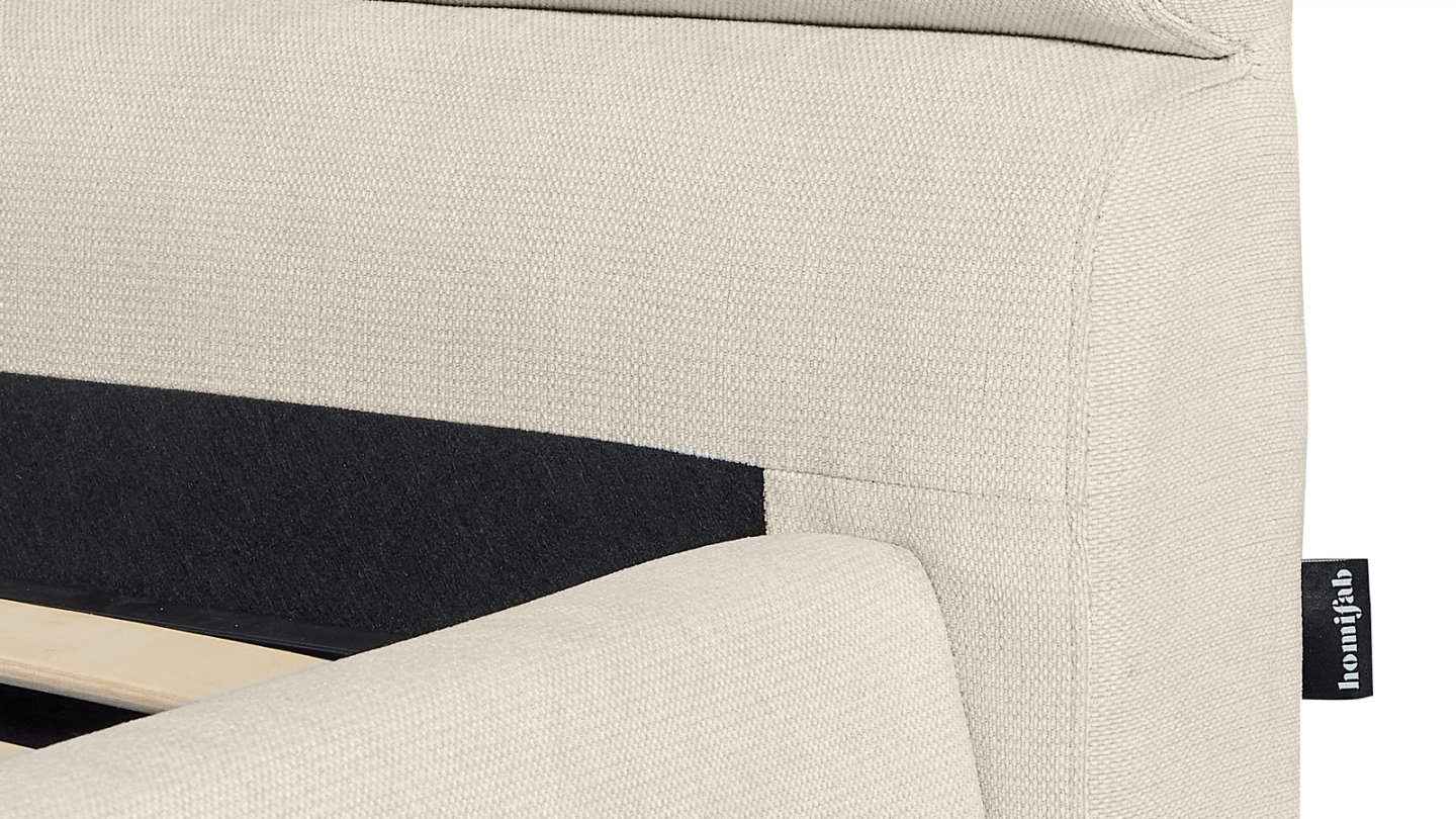 Lit coffre en tissu bouclé - Handy• Structure : Contreplaqué issu de bois FSC, métal• Revêtement : Tissu bouclé 530 g/m² certifié Oekotex• Couleur : Beige• Avec sommier relevable à lattes• Garnissage : Mousse• Sommier 39 lattes (53x9 mm) en bois de peuplier• Dimensions du couchage : 180 x 200 cm• Dimensions totales : 214 x 192 x 36,5 cm• Hauteur du cadre...