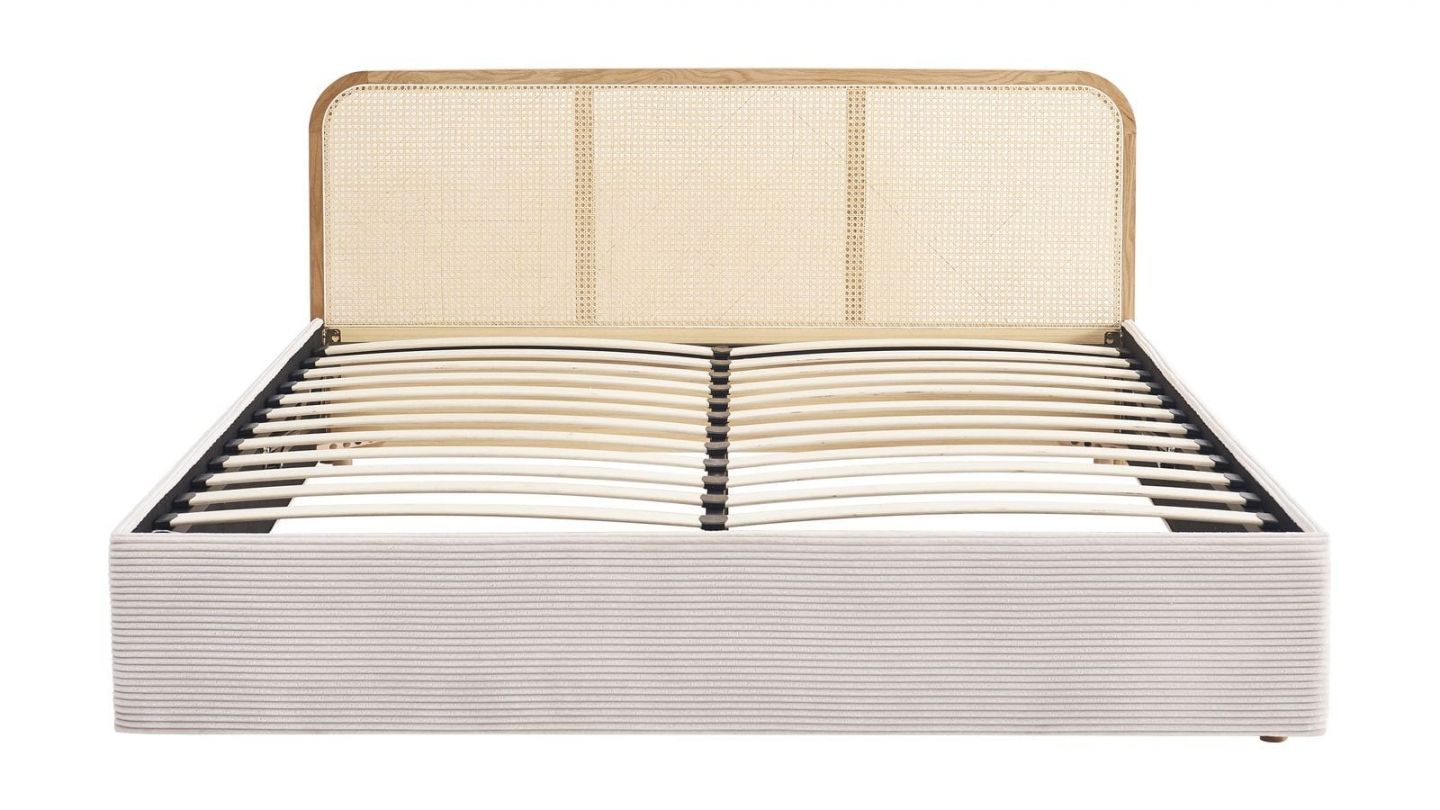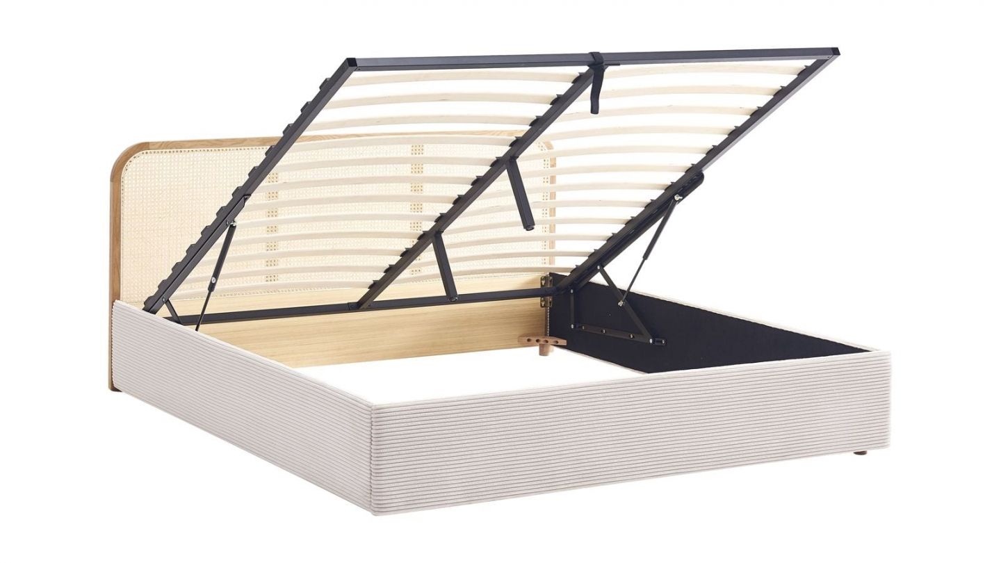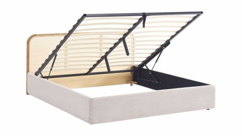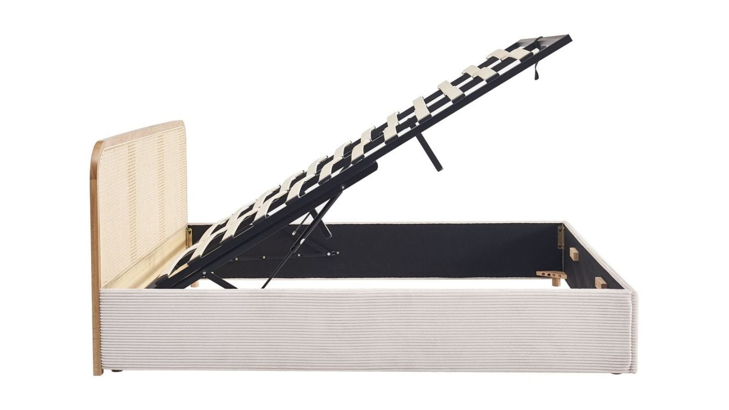 Lit coffre en velours côtelé - Elsa• Structure : Bois, MDF - Tête de lit en frêne massif peint et cannage• Revêtement : Velours côtelé certifié Oeko-Tex• Couleur : Beige• Avec sommier à lattes, tête de lit et coffre de rangement• Sommier à lattes passives• Dimensions du couchage : 160 x 200 cm• Dimensions totales : 208 x 168 x 90 cm• Poids net : 33 kg•...