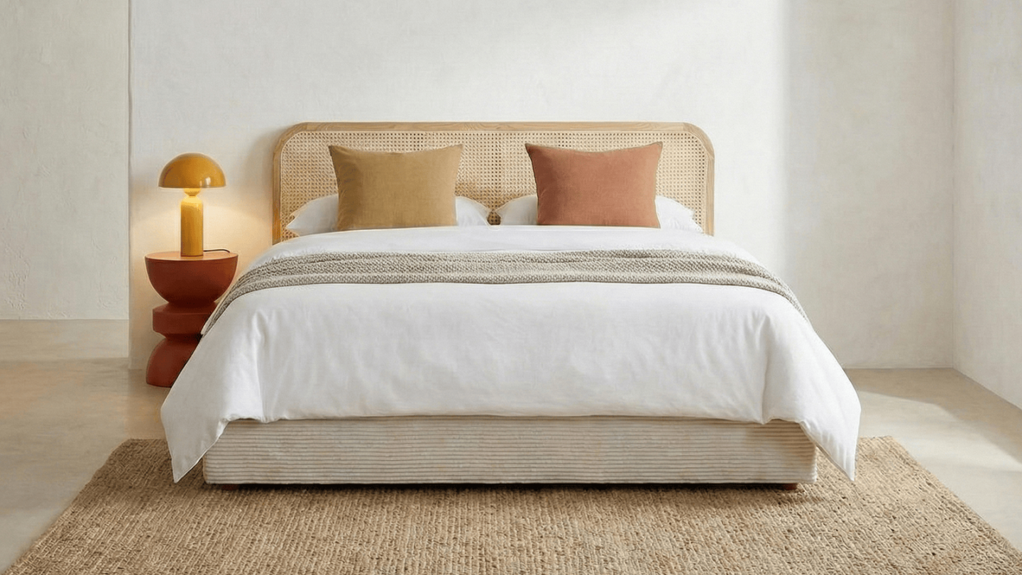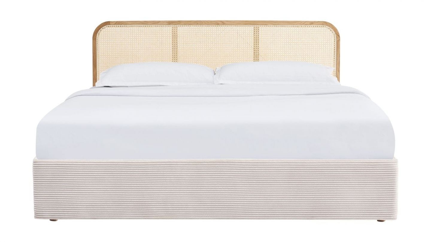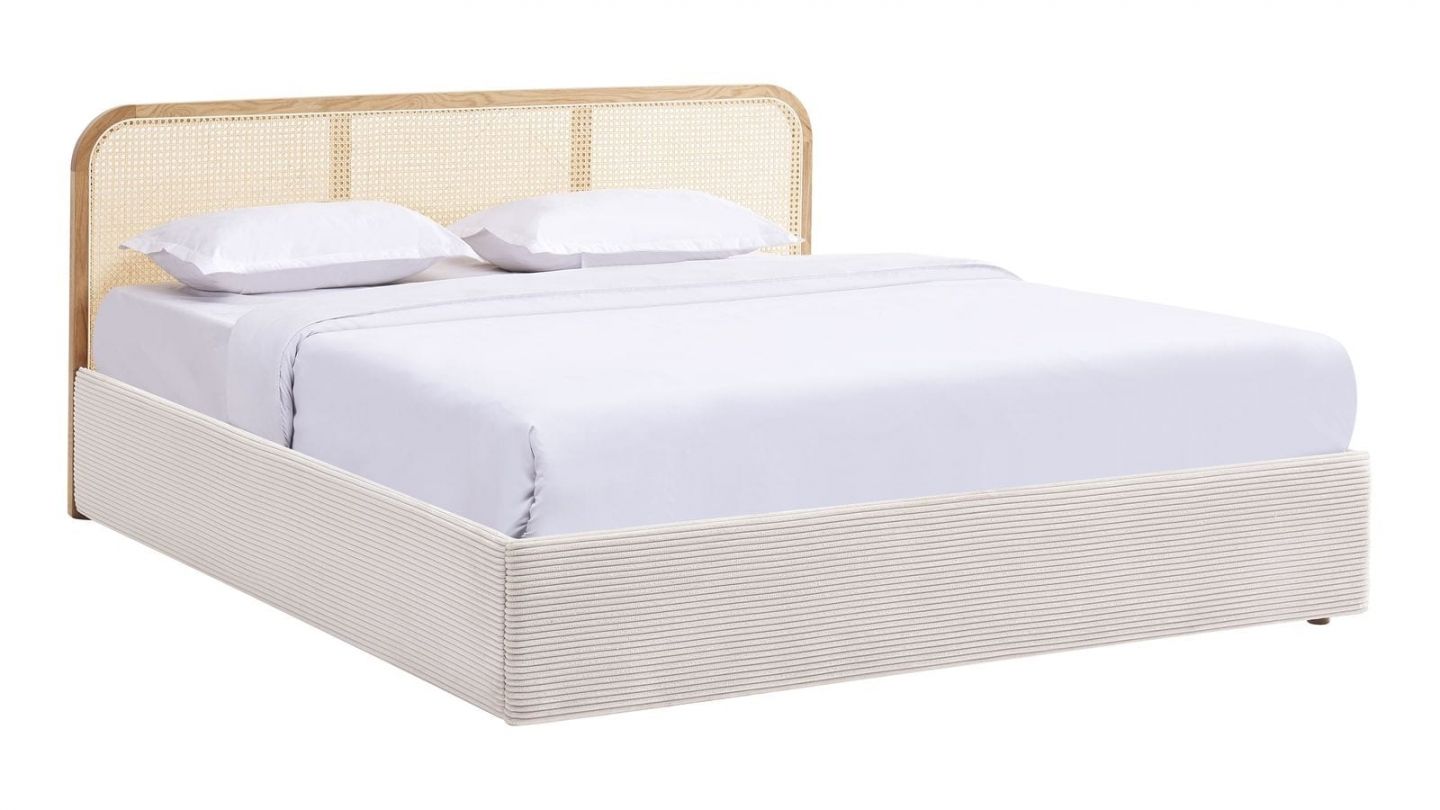 Lit coffre en velours côtelé - Elsa• Structure : Bois, MDF - Tête de lit en frêne massif peint et cannage• Revêtement : Velours côtelé certifié Oeko-Tex• Couleur : Beige• Avec sommier à lattes, tête de lit et coffre de rangement• Sommier à lattes passives• Dimensions du couchage : 160 x 200 cm• Dimensions totales : 208 x 168 x 90 cm• Poids net : 33 kg•...