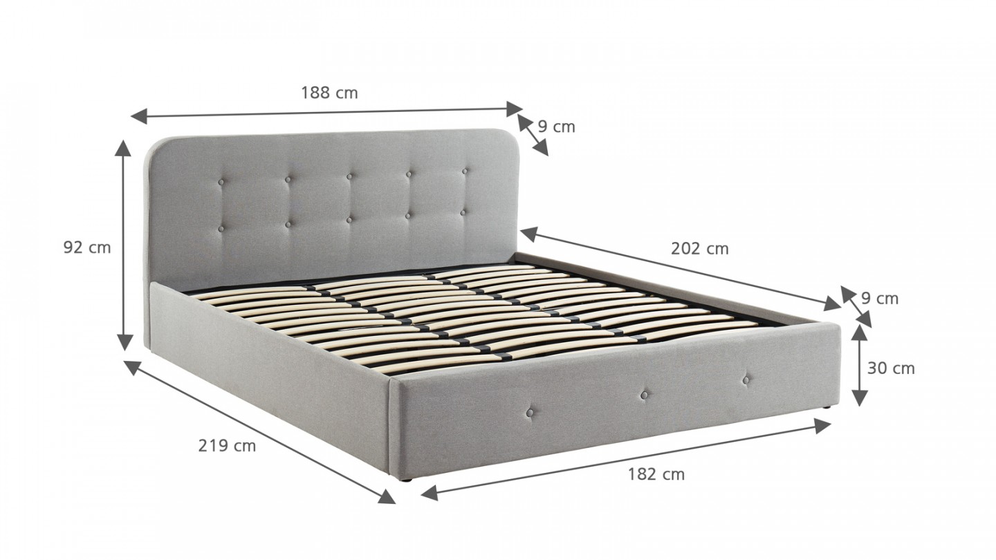 Lit coffre en tissu - Tina• Structure : Contreplaqué issu de bois FSC, métal• Revêtement : Tissu 305 g/m² certifié Oekotex• Couleur : Gris• Avec sommier relevable à lattes et tête de lit• Garnissage : Mousse• Sommier 39 lattes (53x9 mm) en bois de peuplier• Dimensions du couchage : 180 x 200 cm• Dimensions totales : 215 x 190 x 88 cm• Dimensions de la...