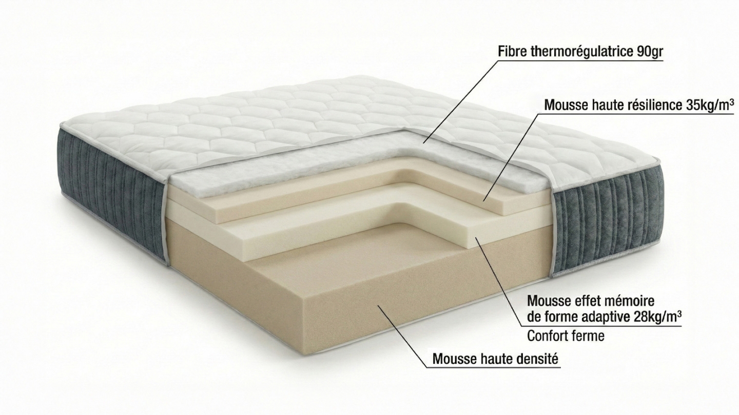 Ce matelas tri-technologies combine trois mousses pour un confort ferme et équilibré :