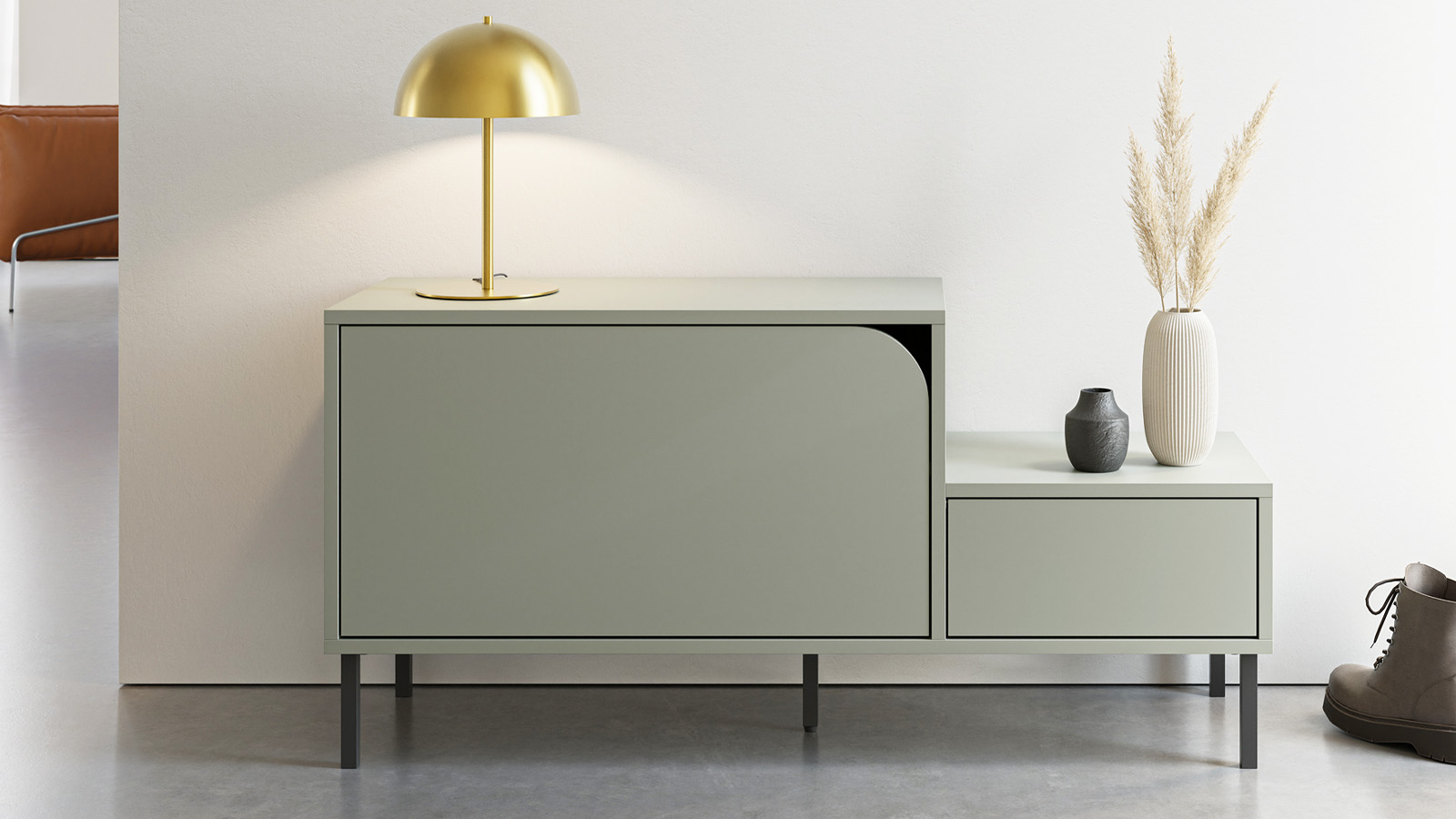 Meuble à chaussures - Jonas • Matière : Mélamine, métal • Couleur : Beige • Piètement en métal beige • Rangements : 2 portes abattantes, 1 tablette - Peut contenir jusqu'à 8 paires de chaussures • Dimensions totales : 120 x 38.5 x 58.5 cm
