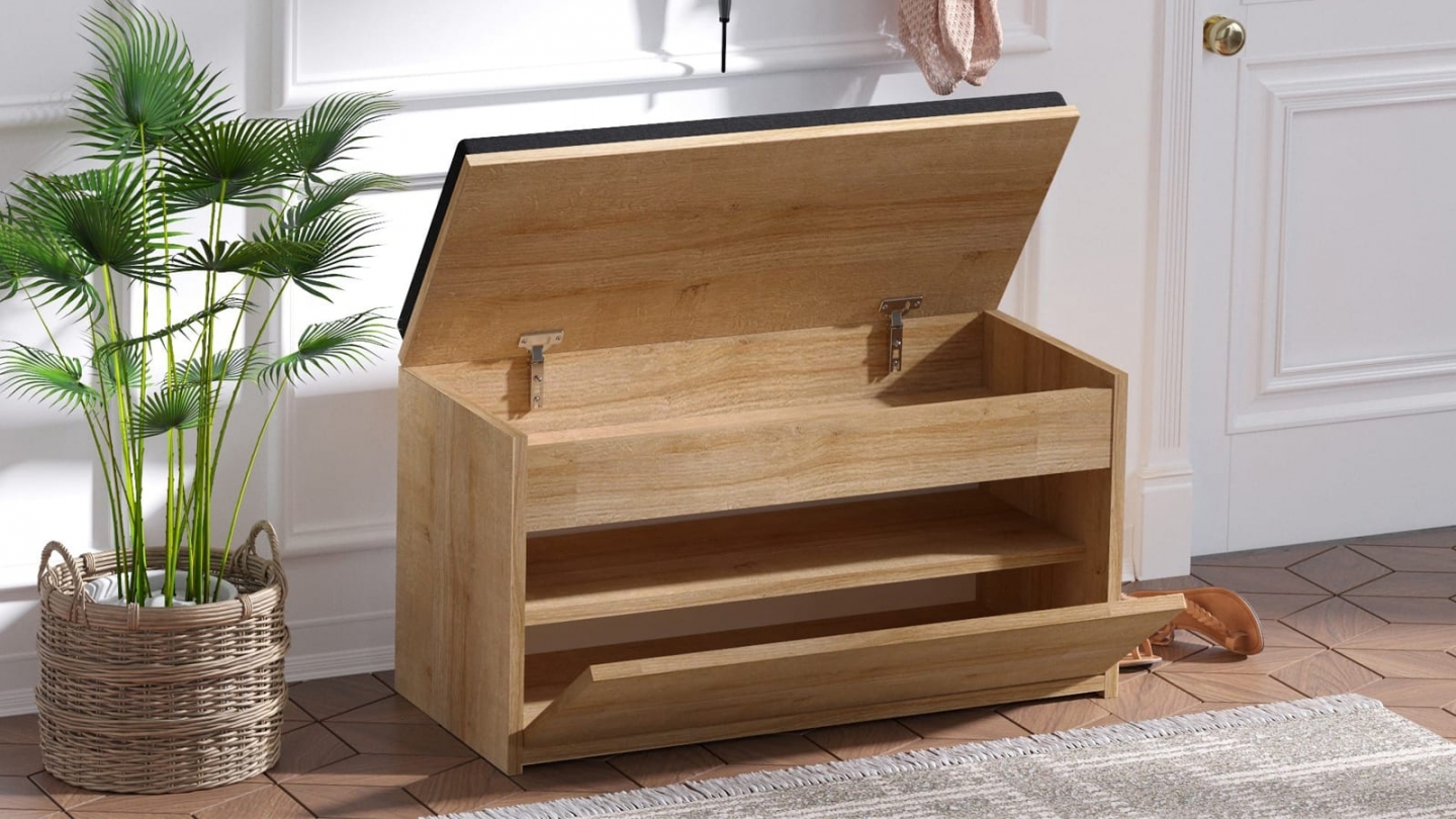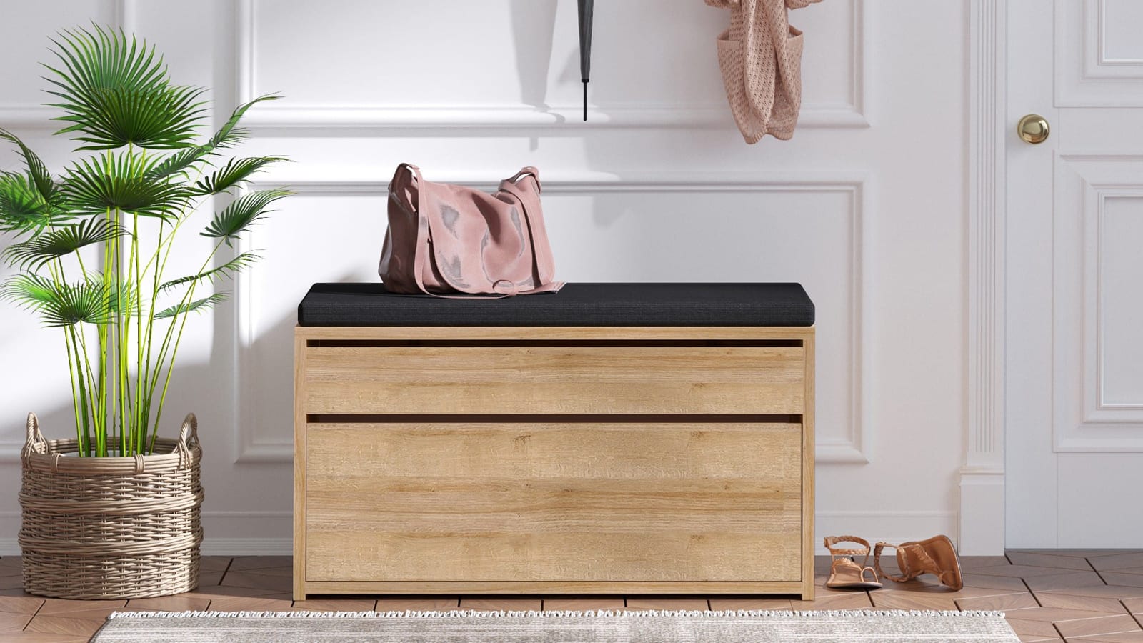 • Ensemble d’entrée pratique et esthétique composé d’un meuble à chaussures avec assise rembourrée et d’une patère murale assortie. Alliant bois clair et coussin noir, il offre un rangement fonctionnel pouvant accueillir 4 à 6 paires de chaussures et un espace pour s’asseoir tout en apportant une touche chaleureuse à l’entrée.