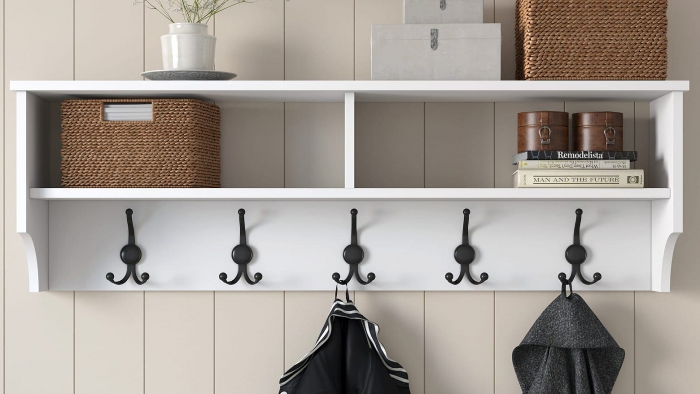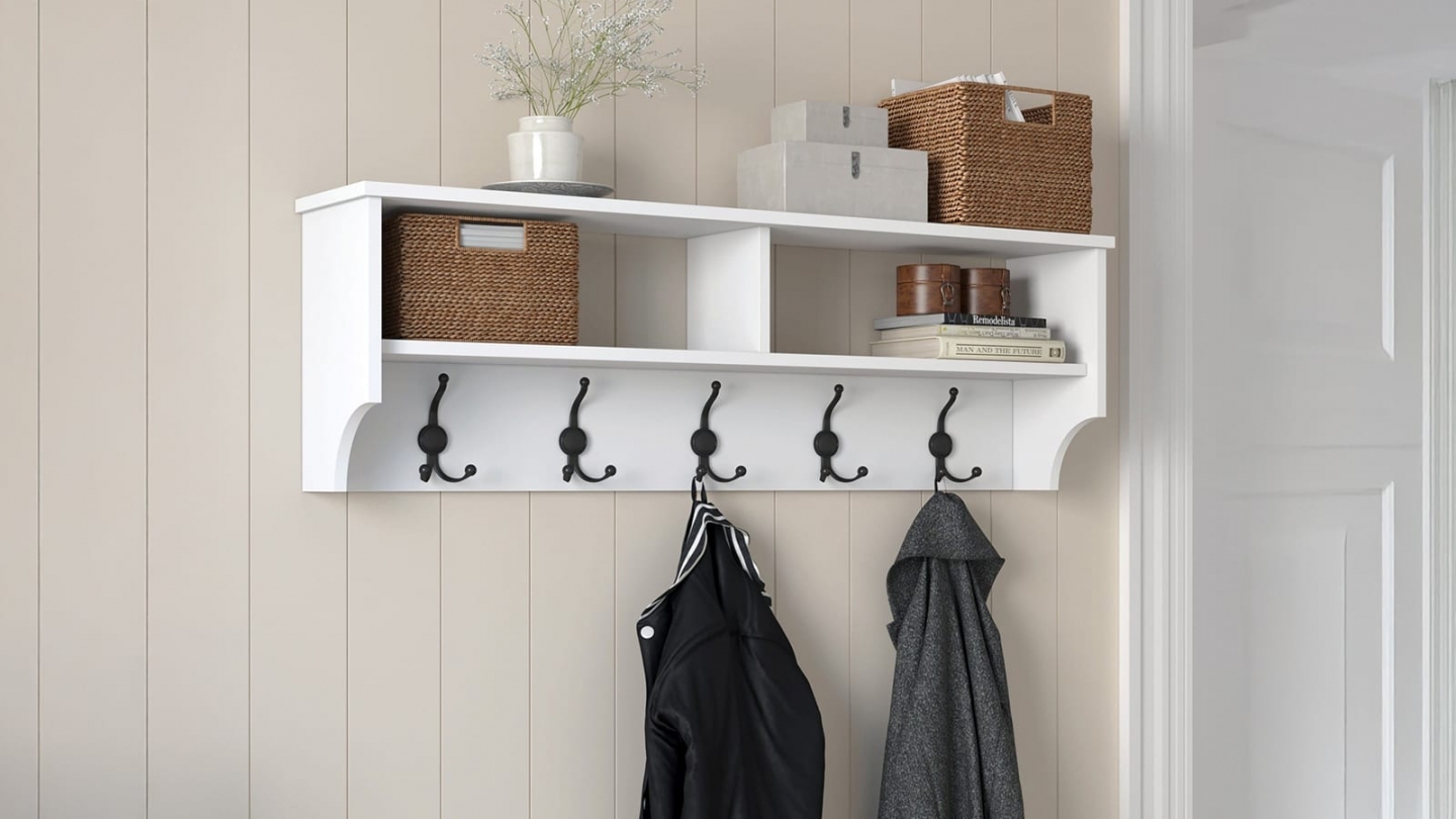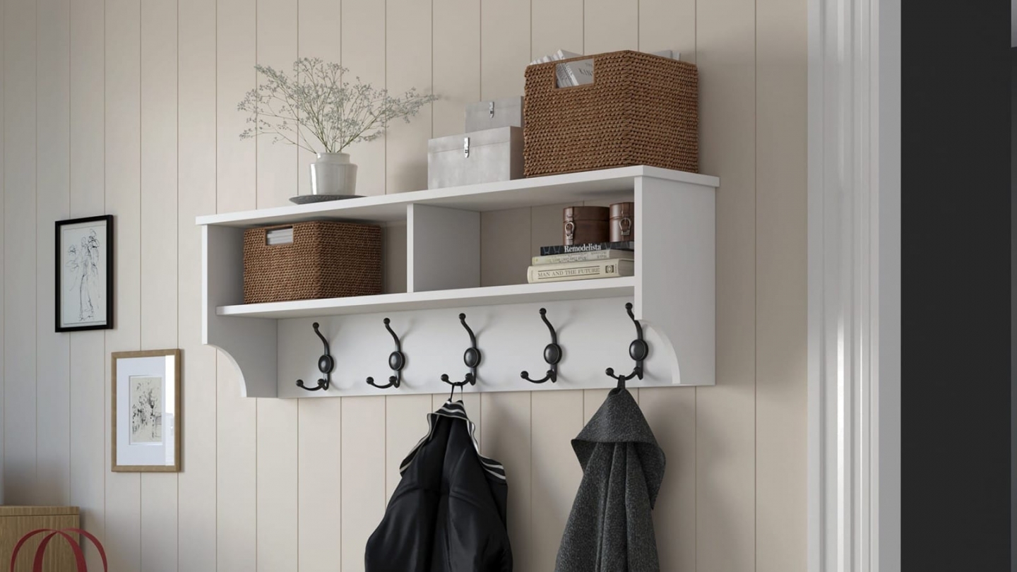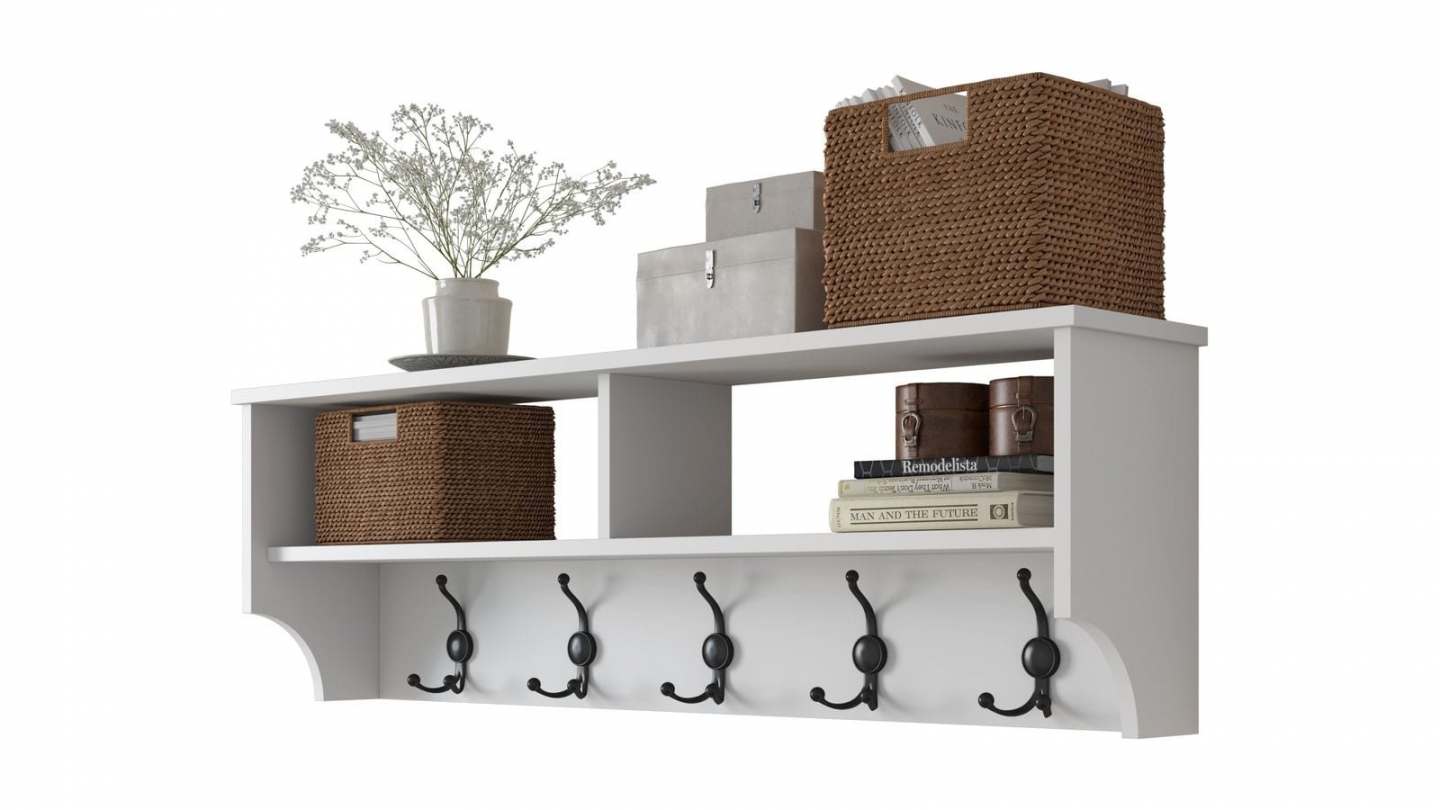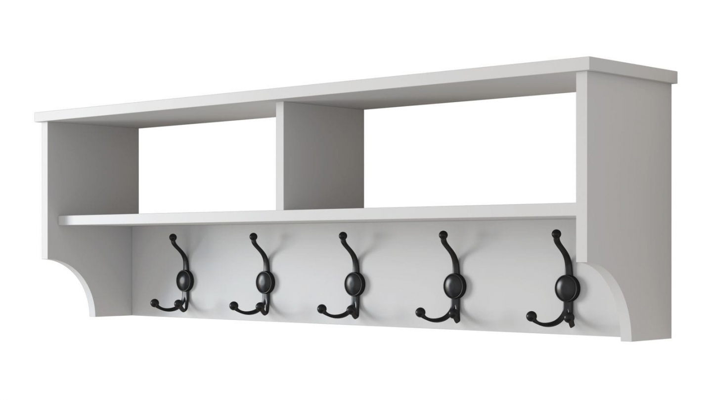 • Étagère murale avec patères offrant un espace de rangement pratique pour vos manteaux, accessoires et objets du quotidien. A fixer au mur.