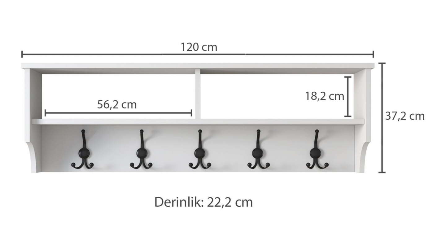 Etagère murale - Taren• Matière : Mélamine, Métal• Couleur : Patère : blanc - Tablette supérieure : effet Noyer - Crochets : noir• Étagère murale avec patères offrant un espace de rangement pratique pour vos manteaux, accessoires et objets du quotidien. A fixer au mur.• Rangements : 2 niches• Dimensions totales : 120 x 22,2 x 37,2 cm