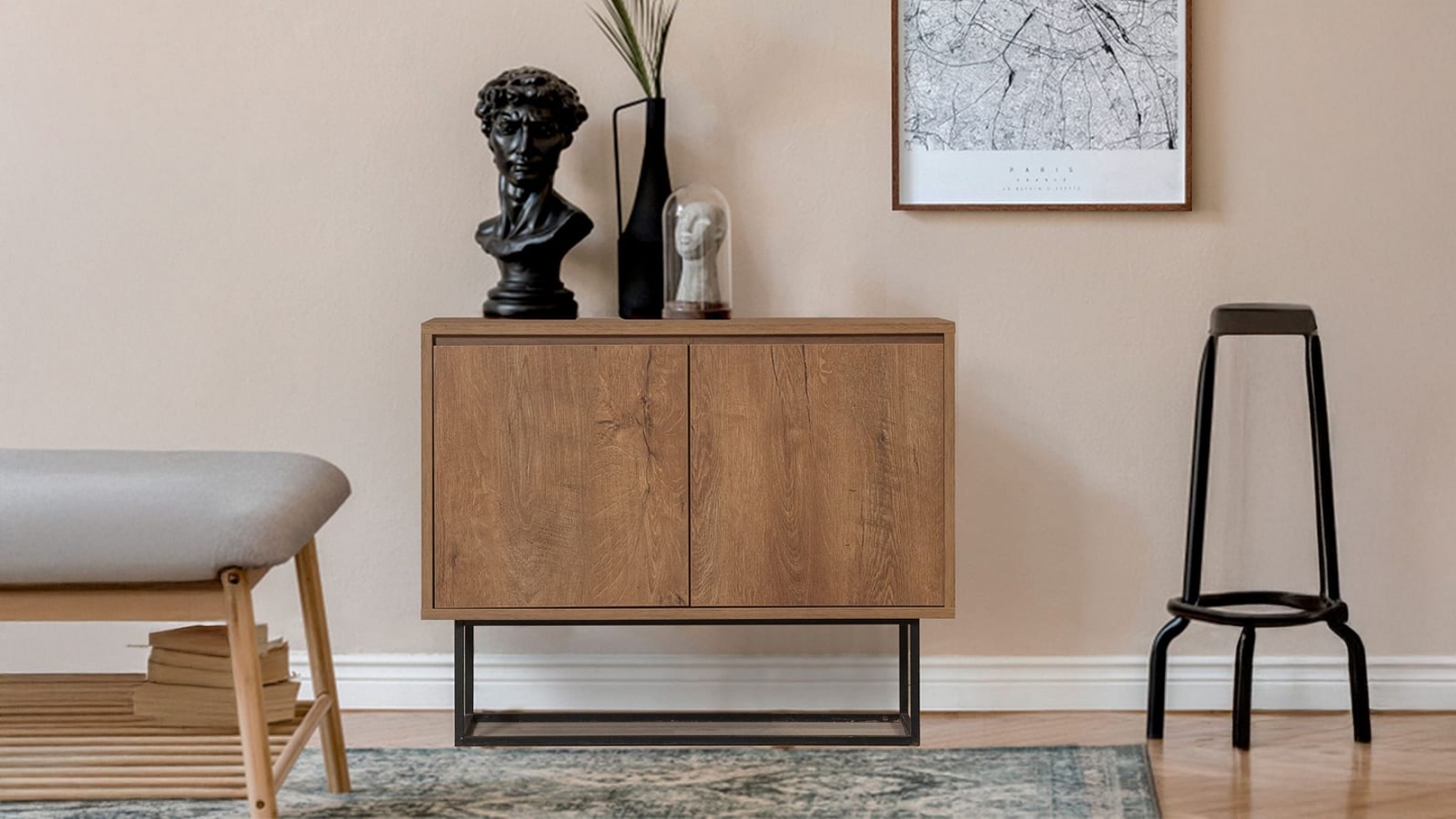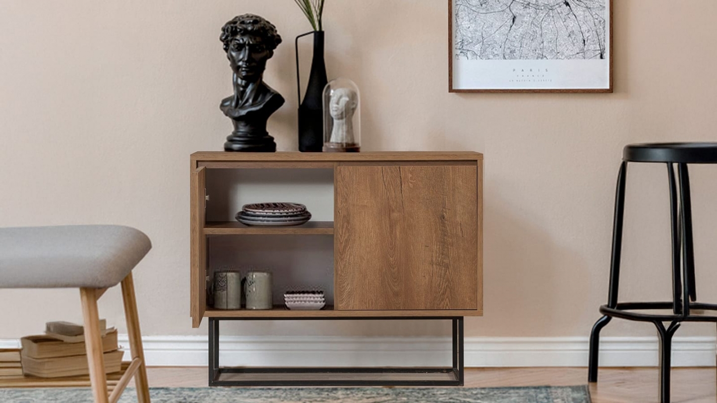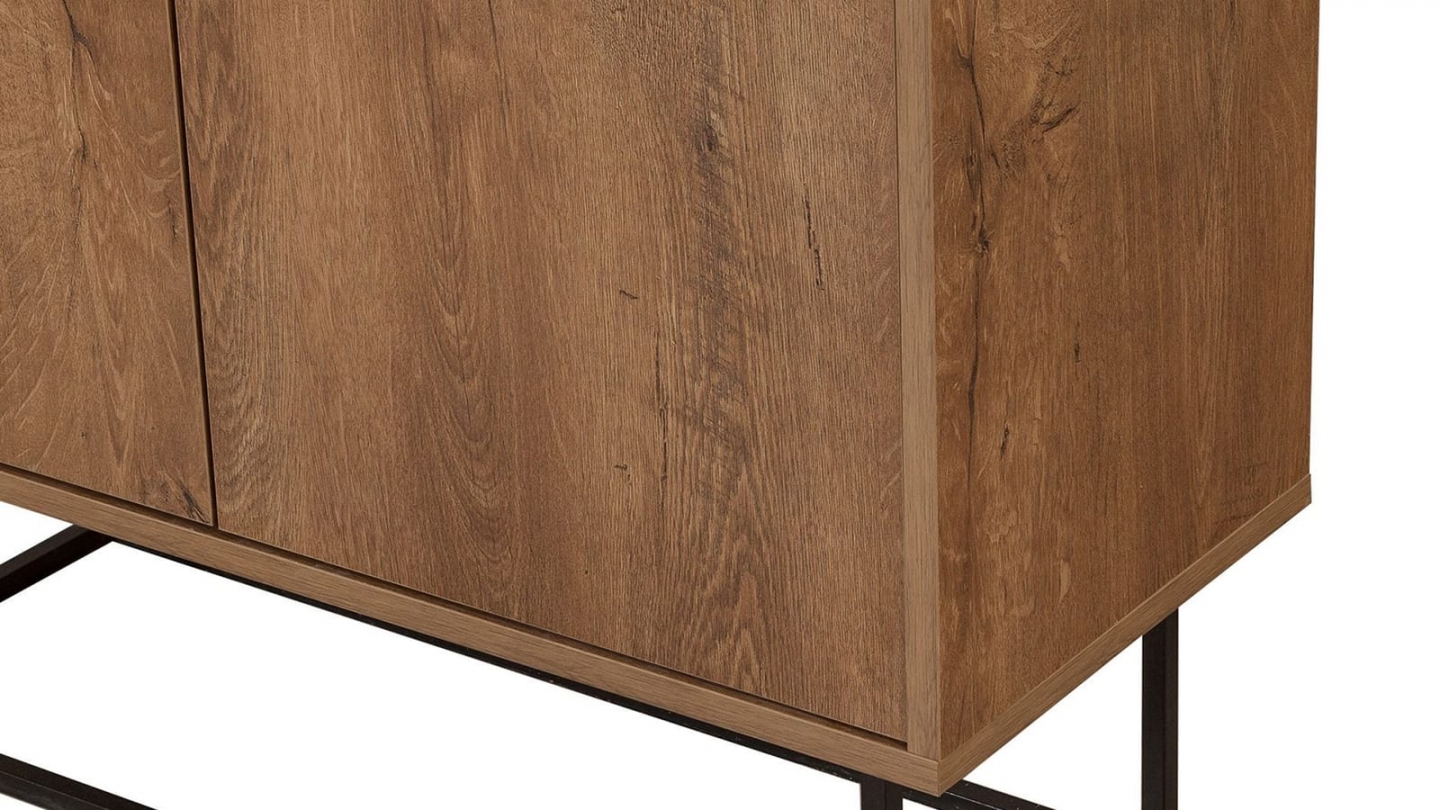 • Buffet contemporain alliant structure bois et piètement métallique, offrant un grand espace de rangement derrière ses portes discrètes.