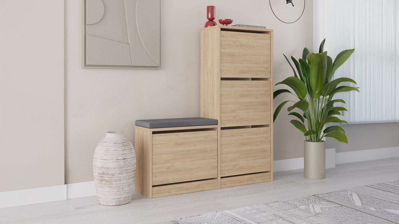 • Meuble à chaussures pratique et esthétique, combinant rangements à abattants et assise rembourrée, pouvant accueillir jusqu’à 16 paires de chaussures. Son design en bois apporte une touche naturelle et chaleureuse à l’entrée tout en optimisant l’espace.