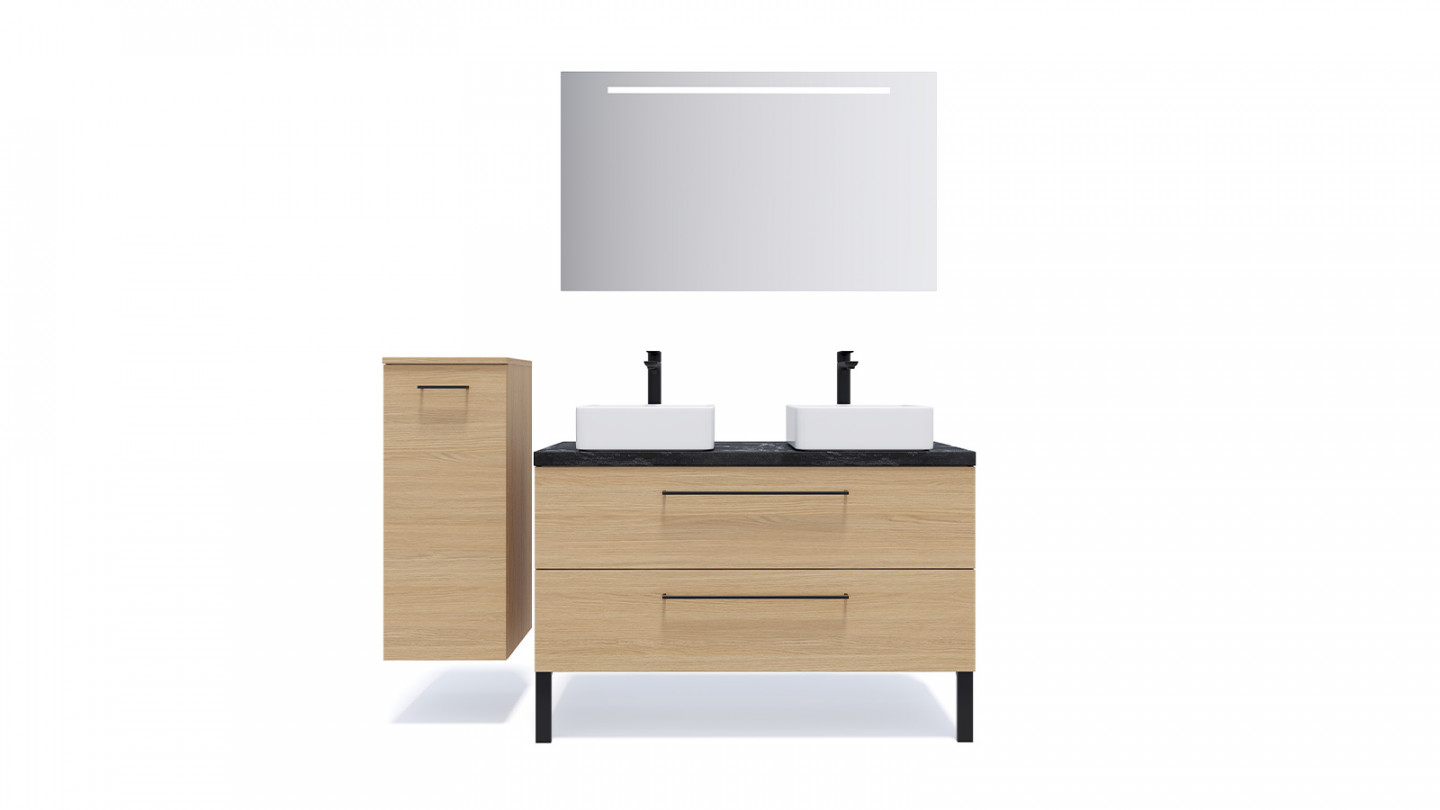 En stock• Ensemble Meuble, 2 vasques à poser, miroir et colonne• Couleur du meuble : chêne clair• Finition du meuble : texturé• Poignées noir• Plan de toilette stratifié couleur• Vasque carrée en céramique - Blanc brillant• Nombre de tiroirs : 2 - Les tiroirs sont équipés du système softclose• Demi-colonne 1 porte - ouverture à gauche• Dimensions du meuble de...